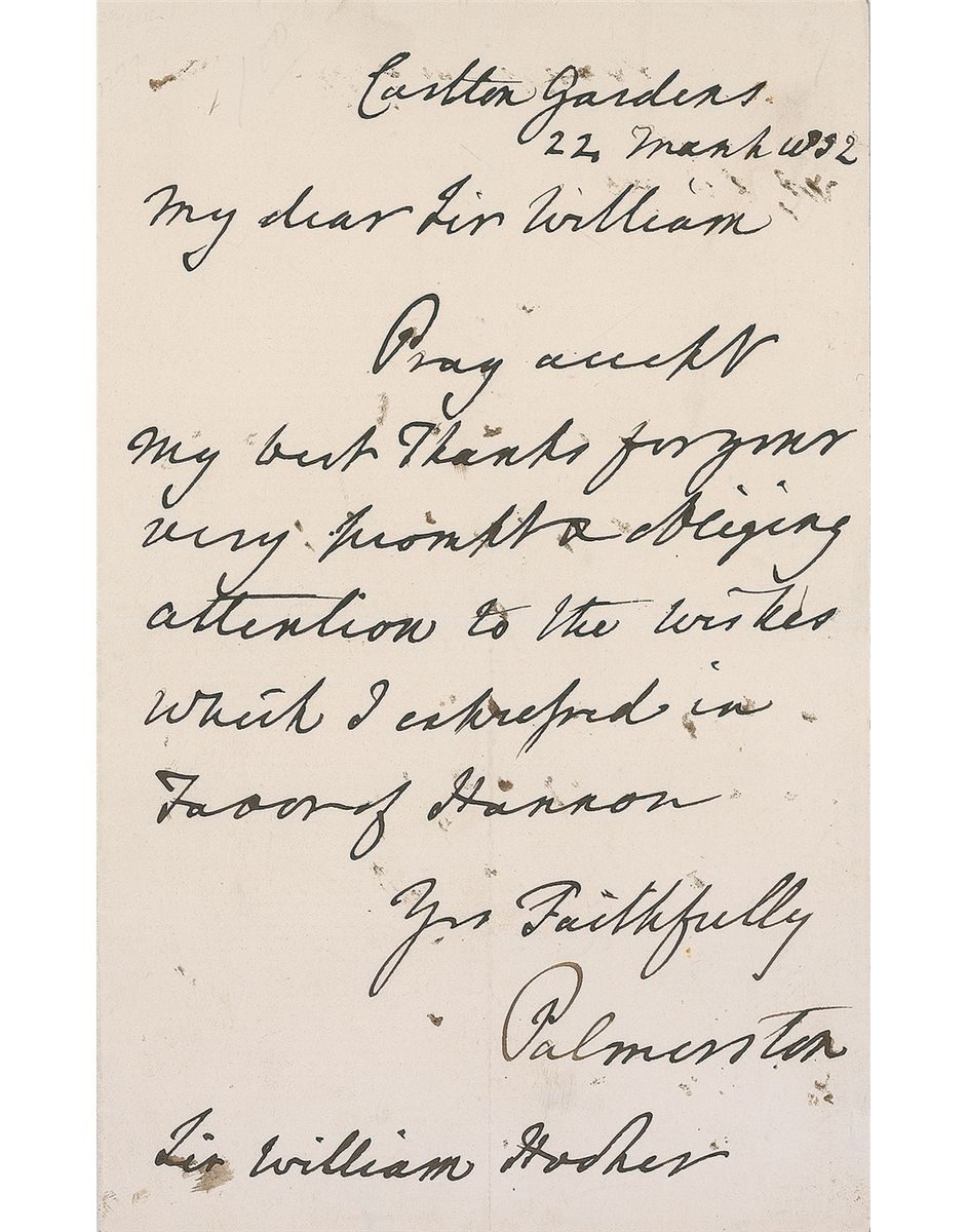 British statesman (1784–1865) who served twice as Prime Minister of the United Kingdom in the mid-19th century. ALS signed “Palmerston,” one page, 4.5 x 7, March 22, 1832. Short letter to botanist Sir William Hooker. In part: “Pray accept my best thanks for your very prompt & obliging attention.” Central horizontal and vertical folds, a few stray ink marks, and some light mirroring of ink, otherwise fine condition. Accompanied by an engraved portrait with pre-printed signature.