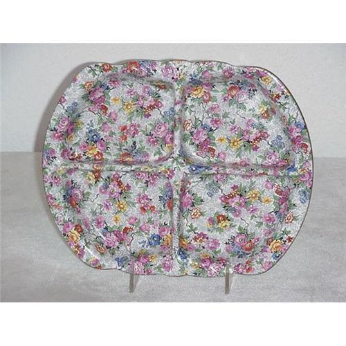 "Marina" chintz by Lord Nelson ware, made in England, A four section dish, 10 1/2' long, 8 1/2' wide. Beautiful condition but for some minimal crazing on the underside. Marked as shown.