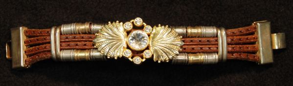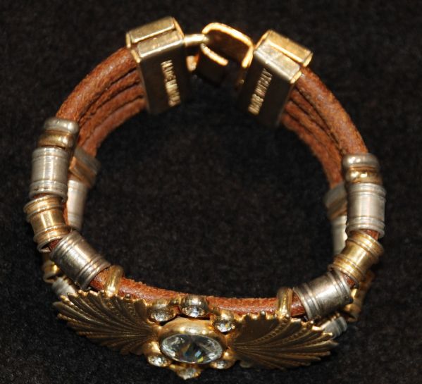 Exquisitely made leather and gilt bracelet with cut crystals, specially designed and hand made in Italy for use in the “LORD OF THE RINGS:THE FELLOWSHIP OF THE RINGS”. A great looking prop worn by one of the extras in the movie.size 1"x7.5"