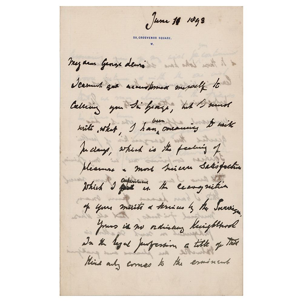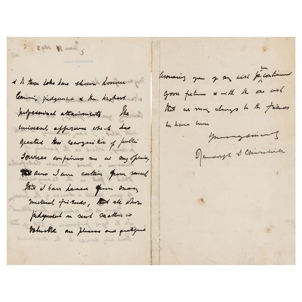 British statesman (1849–1895) and the father of Winston Churchill; he led the so-called Fourth Party, a group of Conservative members of Parliament who advocated social and constitutional reform. ALS signed “Randolph S. Churchill,” three pages, 5 x 8, 50 Grosvenor Square letterhead, June 11, 1893. Handwritten letter to noted English lawyer George Lewis, in part: "Yours is no ordinary Knighthood. In the Royal profession a title of that kind only comes to the eminent & to those who have shown honour, learning judgment & the highest professional attainments. The universal approval which has greeted this recognition of public services confirms me in my opinion.” In very good to fine condition, with tape along the hinge.
