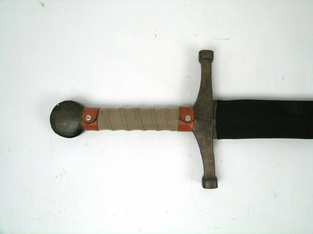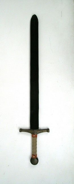 During pre-production and into the production itself of the epic "Lord of the Rings" films, great attention was played for both effects, art direction, costumes, and of course the real-live action. Actors had to become experts in all aspects of battle. This is an actor's off camera practice sword used during production. Hard foam hilt and handle with fabric wrapped grip. Foam blade with rigid core and black fabric cover. Approx. 44" long and 9" wide at hand guard. Oversized item. Additional postage required.