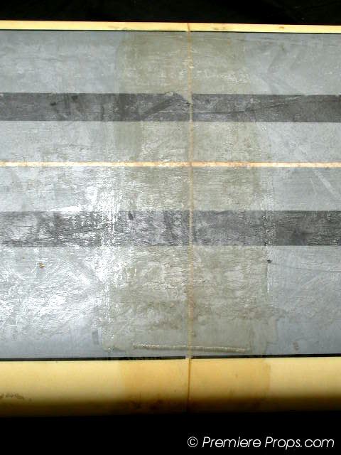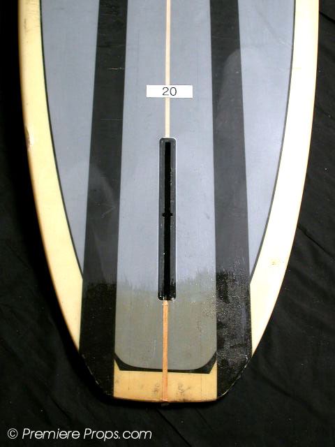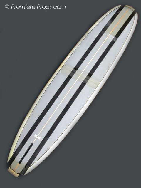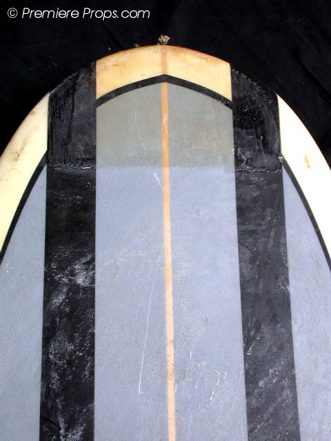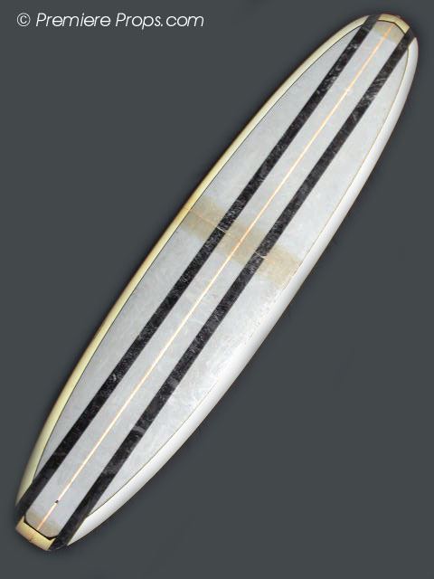 Grey & Black Striped Long Board Surf Board (108" x 23" / minor wax has been applied to top of board / minor dings and scratches from use / board has been cracked in middle and repaired with epoxy by production / no fin / used on screen)