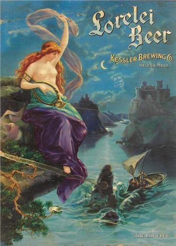 Lorelei Beer Kessler Brewing Co. Paper Sign, Helena, MT. Stained and lower right corner missing. Image 14 X 20 inches.