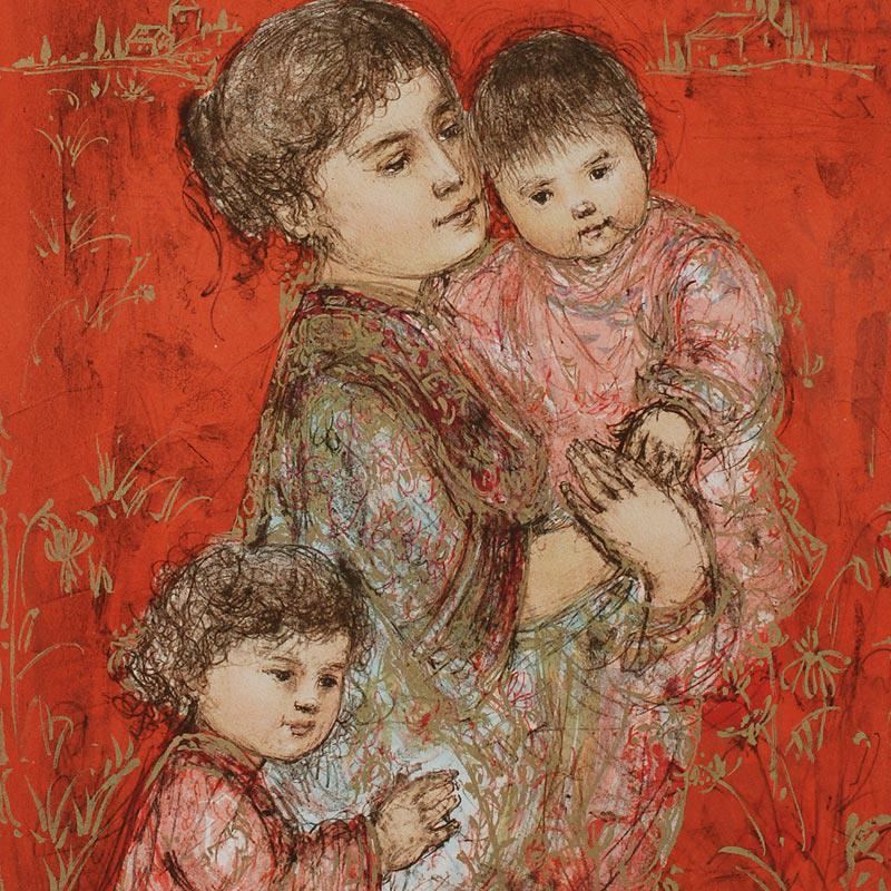"Lorelei and Children" is a limited edition lithograph on paper, numbered and hand signed by Edna Hibel (1917-2014). Includes Certificate of Authenticity! Measures approx. 20" x 26" (with border), 16.5" x 22" (image).