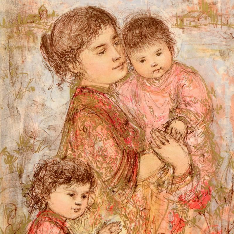 "Lorelei and Children" is a limited edition lithograph on rice paper by Edna Hibel (1917-2014), numbered and hand signed by the artist. Includes Certificate of Authenticity. Measures approx. 19.5" x 25.5" (border), 16" x 22" (image).