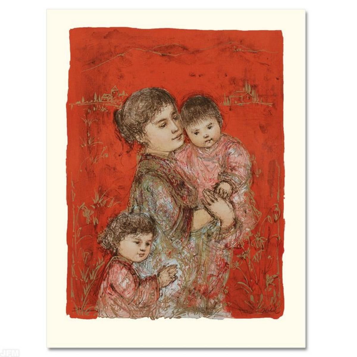 "Lorelei and Children" is a limited edition lithograph on paper, numbered and hand signed by Edna Hibel (1917-2014). Includes Certificate of Authenticity! Measures approx. 20" x 26" (with border), 16.5" x 22" (image).