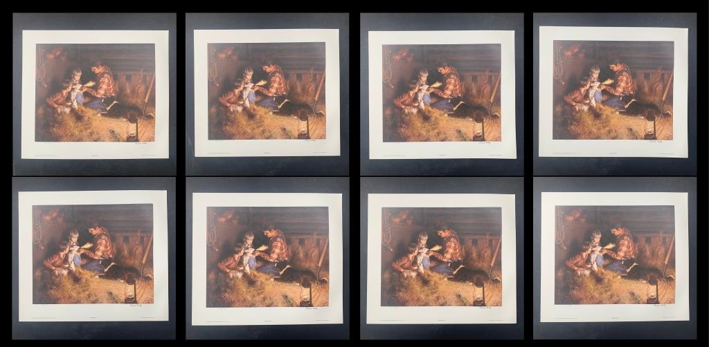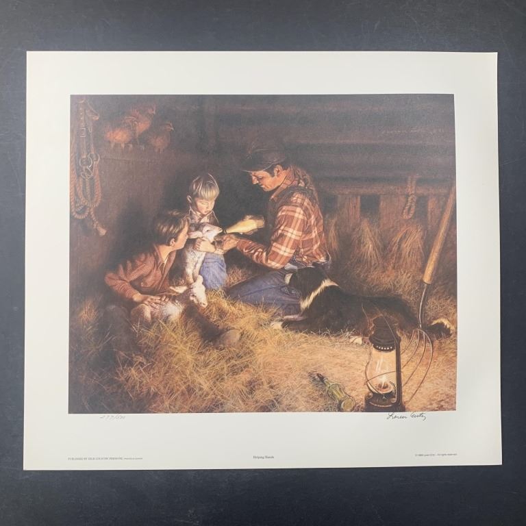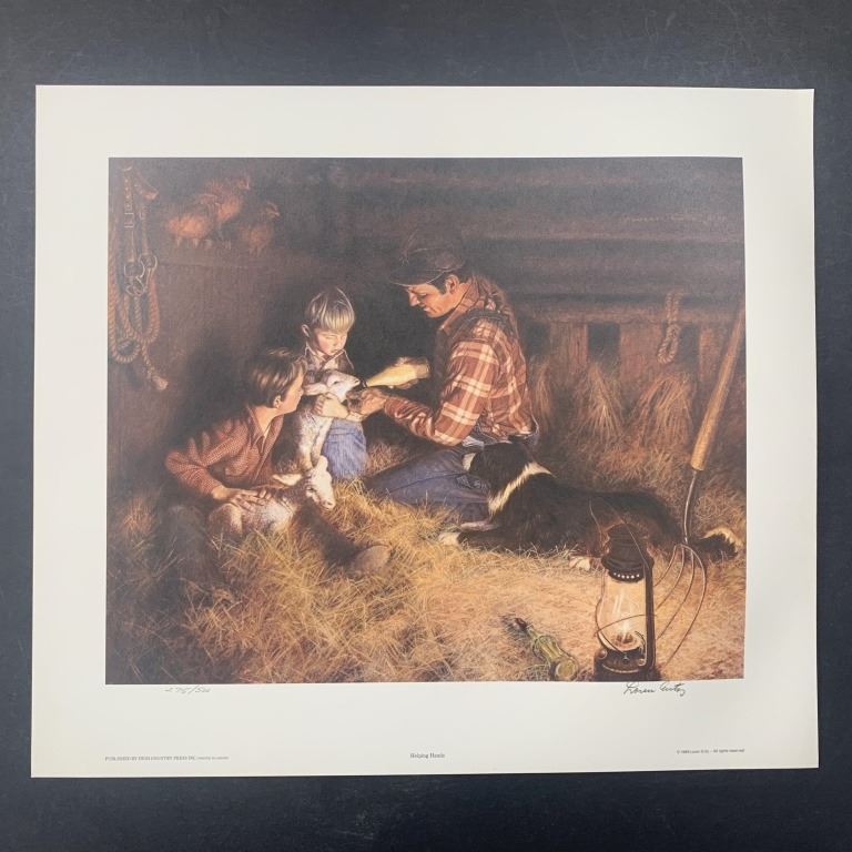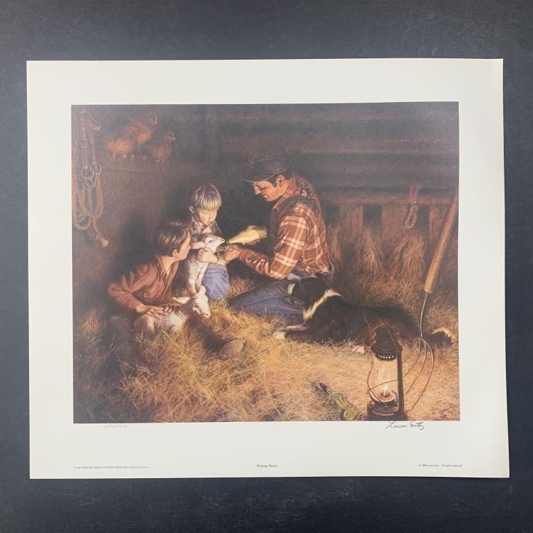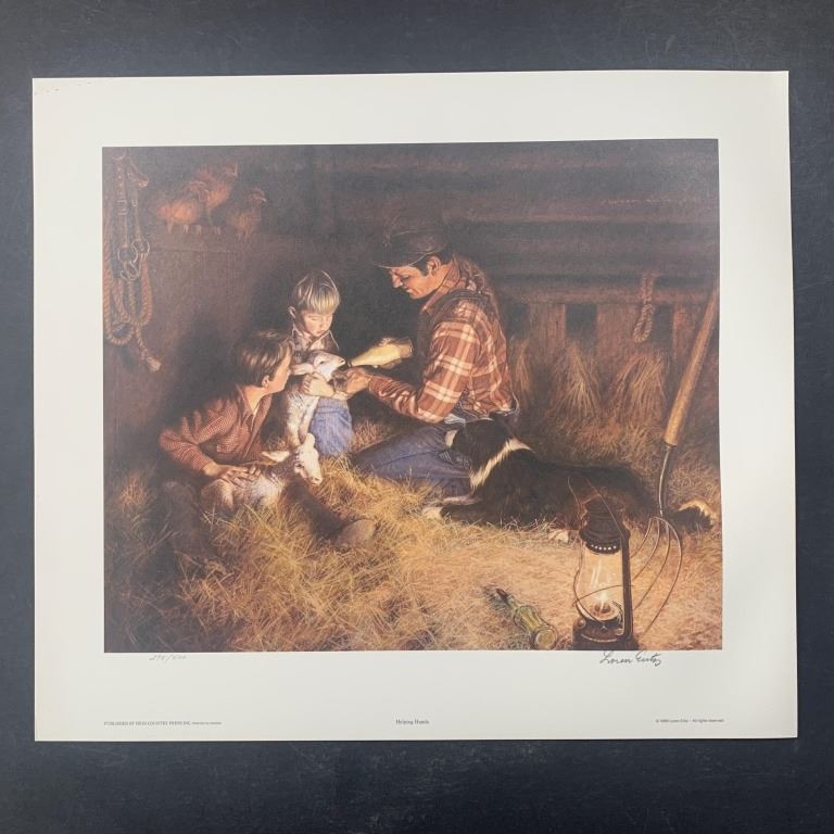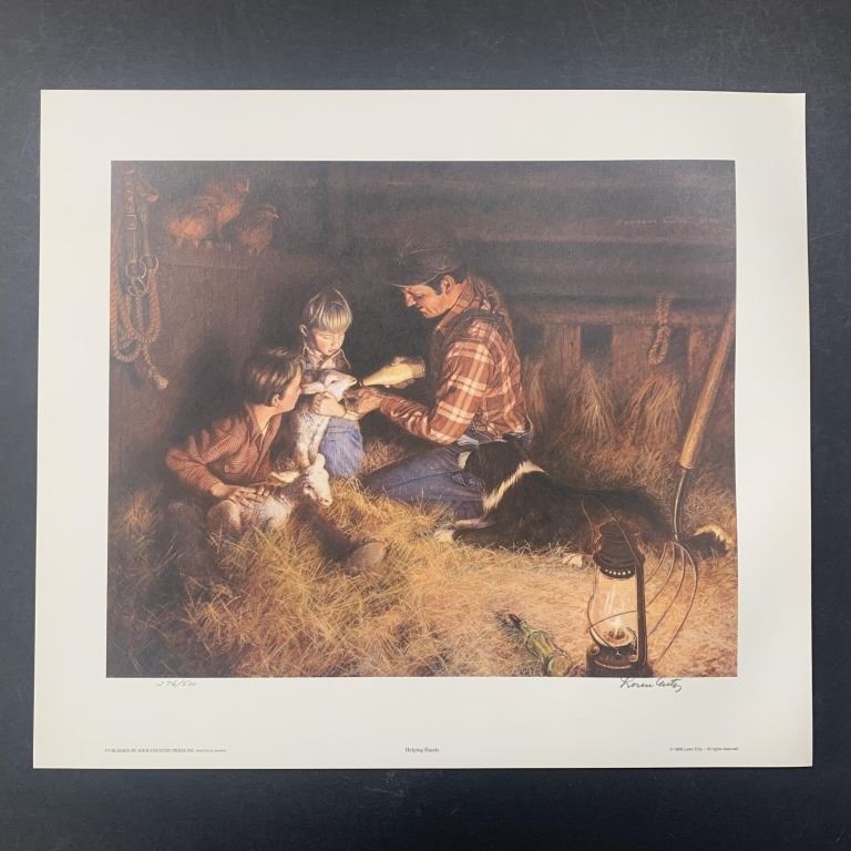 Loren Entz's "Helping Hands" limtied edition prints, signed lower right and numbered lower left of an edition size of 500. There are 9 prints in total, each in excellent condition. This is an image of a farmer father who is showing his two sons how to give milk to a baby sheep.