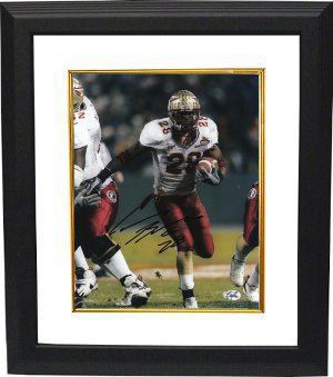 In 2004, his Sophomore Year at Florida State, Lorenzo Booker led the team in carries with 173, and was second in both rushing yards (887) and touchdowns (4), and also had 24 catches for 160 yards. Booker led the Seminoles in rushing yards, carries, and touchdowns in his junior year in 2005, with 119 carries for 552 yards (4.8 avg) and four touchdowns. He also recorded 38 receptions for 329 yards and 2 touchdowns. Lorenzo Booker has hand autographed this Florida State Seminoles 8x10 Photo. Custom White Mat and Premium Black Color Frame. FI Hologram and Certificate of Authenticity from Athlon Sports.