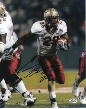 In 2004, his Sophomore Year at Florida State, Lorenzo Booker led the team in carries with 173, and was second in both rushing yards (887) and touchdowns (4), and also had 24 catches for 160 yards. Booker led the Seminoles in rushing yards, carries, and touchdowns in his junior year in 2005, with 119 carries for 552 yards (4.8 avg) and four touchdowns. He also recorded 38 receptions for 329 yards and 2 touchdowns. Lorenzo Booker has hand autographed this Florida State Seminoles 8x10 Photo. FI Hologram and Certificate of Authenticity from Athlon Sports.