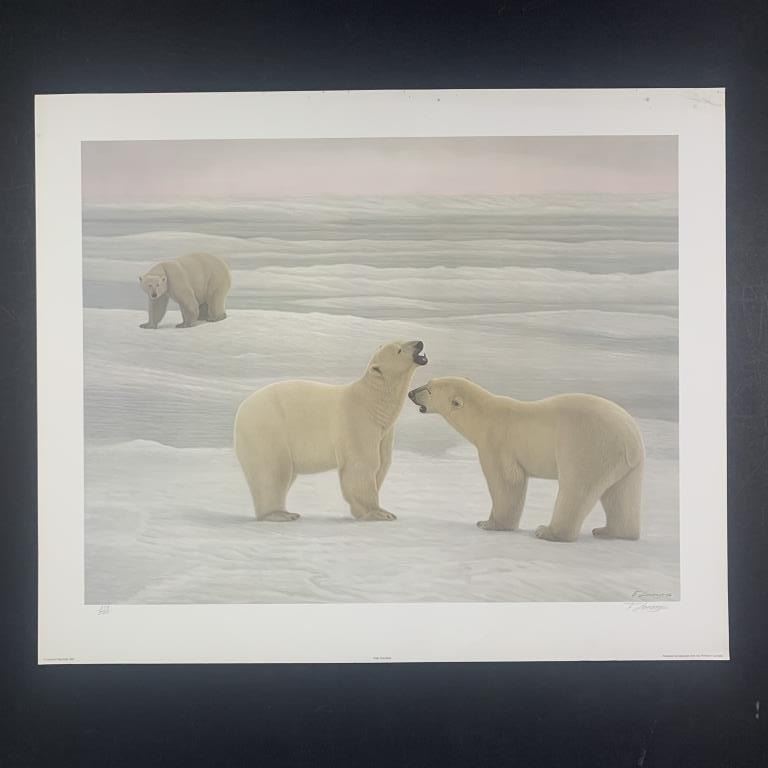 Lorenzo Fracchetti's "Polar Courtship" limited edition print, signed lower right and numbered 373/500 lower left. This piece is of two polar bears, clearly courting, with another polar bear in the background watching them. This piece is in good condition with soiling at upper right, but easily hidden under matting.