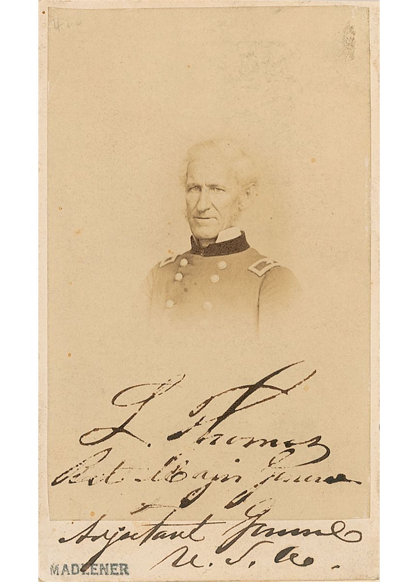 Controversial army officer (1804–1875) who did not get along well with Secretary of War Edwin M. Stanton; President Johnson attempted to replace Stanton with Thomas without support of Congress, which was the reason behind his impeachment. Original 2.5 x 4 carte-de-visite bust portrait of Thomas in uniform by F. Gutekunst of Philadelphia, signed at the bottom in black ink, “L. Thomas, Bvt. Major General and Adjutant General, U. S. A.” In very good condition, with light scattered soiling, an ink stamp to the lower border, and moderate irregular adhesion to the signature.