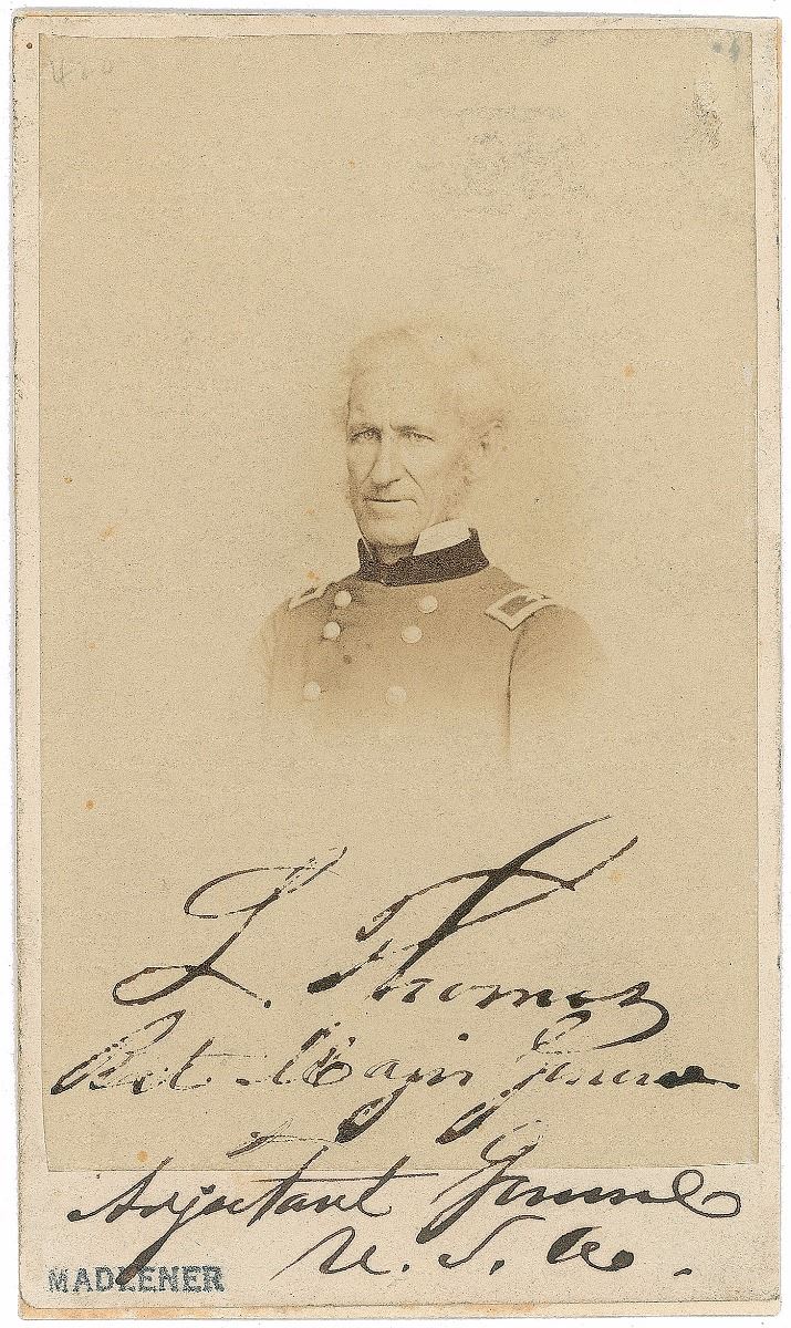 Controversial army officer (1804–1875) who did not get along well with Secretary of War Edwin M. Stanton; President Johnson attempted to replace Stanton with Thomas without support of Congress, which was the reason behind his impeachment. Original 2.5 x 4 carte–de–visite bust-length portrait of Thomas in uniform, signed in black ink, “L. Thomas, Bvt. Major General & Adjutant General, U. S. A.” Published by F. Gutekunst Photography of Philadelphia. In fine condition, with areas of irregular ink adhesion.
