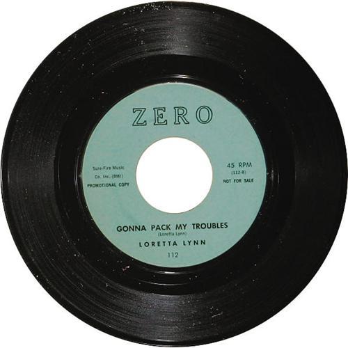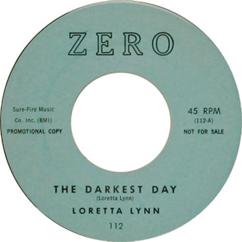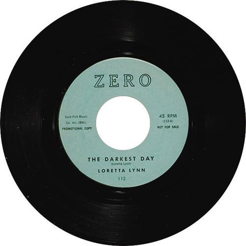 <B>Loretta Lynn "The Darkest Day"/ "Gonna Pack My Troubles" Promo 45 (Zero 112, 1961).</B></I> The then 26-year old future Country Queen penned both sides of her third and final single released on her first record label. Next stop: Decca and super-stardom! This is a terrific copy of a rare disc. Condition: NM 8.<BR><BR><b>Shipping:</b> Recordings (<a target="_blank" href="http://www.heritageauctions.com/common/shipping.php">view shipping information</a>)
