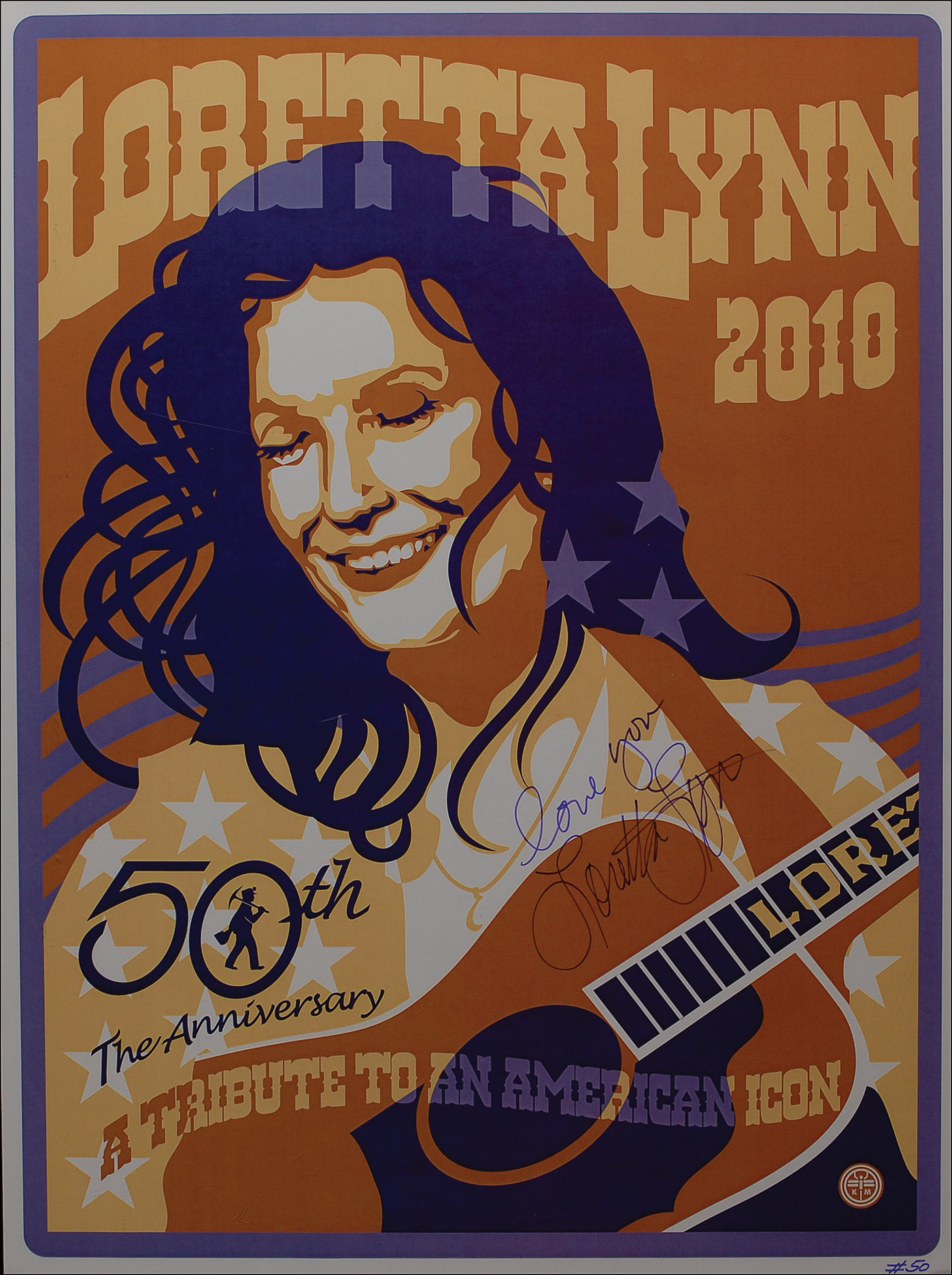 Color 18 x 24 poster celebrating Lynn’s 50th anniversary, #50, signed in purple felt tip, “Love you, Loretta Lynn.” Rolled and in fine condition. Accompanied by a hand signed certificate of authenticity from Lynn stating this poster was personally owned by her.