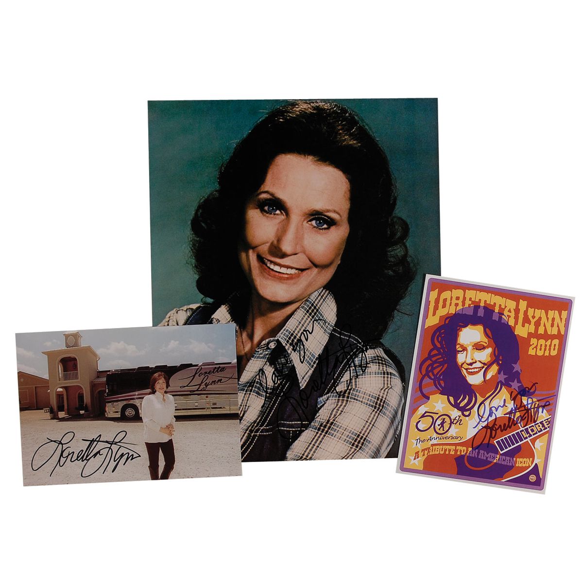 Three items: one color cardstock 8 x 10 head-and-shoulder photo, signed in black felt tip, “love you, Loretta Lynn”; one color postcard, 6 x 4.25, featuring Lynn in front of her tour bus, signed in black felt tip; and one color postcard, 4.25 x 5.5, featuring a poster for the 2010 50th Anniversary Tribute to Loretta Lynn tour, signed in blue felt tip, “love you, Loretta Lynn.” In fine condition.