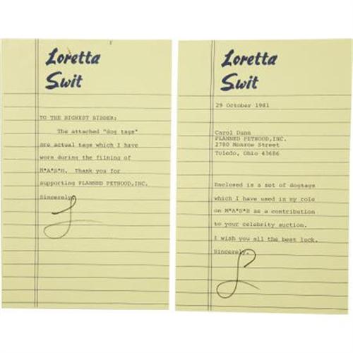 <B>Loretta Swit Prop</B></I> <B><I>M*A*S*H</B></I></B></I> <B>Dog Tags.</B></I> A pair of mismatched dog tags worn by the actress on the popular TV sitcom. In Excellent condition, accompanied by LOAs from Swit and an autographed b&w 8" x 10" of her. <I>Accompanied by a COA from PSA/DNA.</B></I><BR><BR><b>Shipping:</b> Flat Material, Small (<a target="_blank" href="http://www.heritageauctions.com/common/shipping.php">view shipping information</a>)