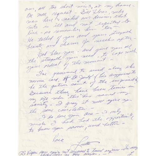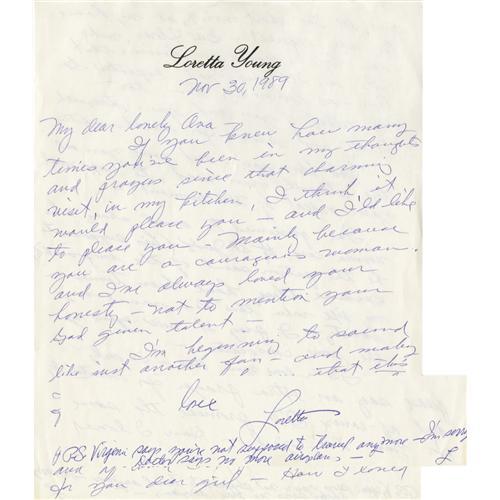 <B>Loretta Young Signed Letter to Ava Gardner.</B></I> A one-page, front-and-back, handwritten letter on personal stationery from Loretta Young to Ava Gardner, dated November 30, 1989. A good friend of Gardner's, Young sends the ailing actress her thoughts and prayers in the letter. Gardner had suffered a stroke earlier that year, and sadly would die two months after this letter was written. <I>From the Ava Gardner Estate.</B></I><BR><BR><b>Shipping:</b> Small Flat (<a target="_blank" href="http://www.heritageauctions.com/common/shipping.php">view shipping information</a>)