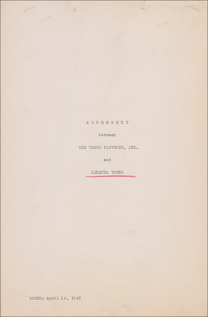 DS, 20 pages, 8.5 x 13, April 19, 1947. Agreement between RKO Studios and Young in which Young agrees to star as the title character in the film Rachel at the rate of $10,000 a week. In fine condition, with some creasing and two punch holes and several staple hole to the top edge. Accompanied by the original agreement folder.