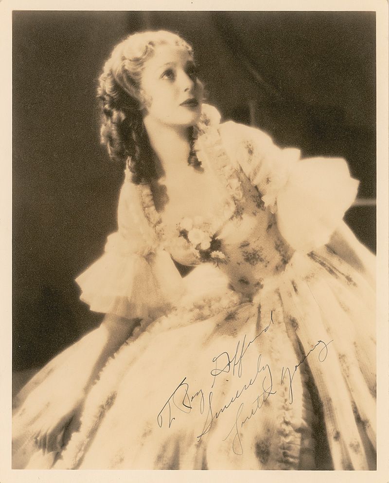Vintage matte-finish 8 x 10 photo of Young in an ornate dress, signed and inscribed in fountain pen “To Ray Gafford, Sincerely, Loretta Young.” In fine condition, with a trivial tack hole to top edge.