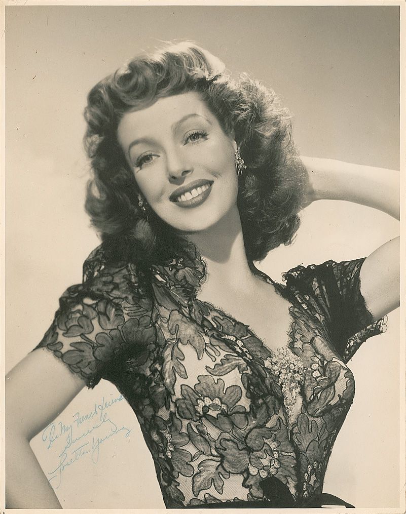 Vintage matte-finish 10.75 x 13.75 photo of Young striking a seductive pose, signed and inscribed in blue ink “To my French friends, Sincerely, Loretta Young.” In fine condition, with some scattered edge and corner creases and signature and inscription a shade or two light, but legible.