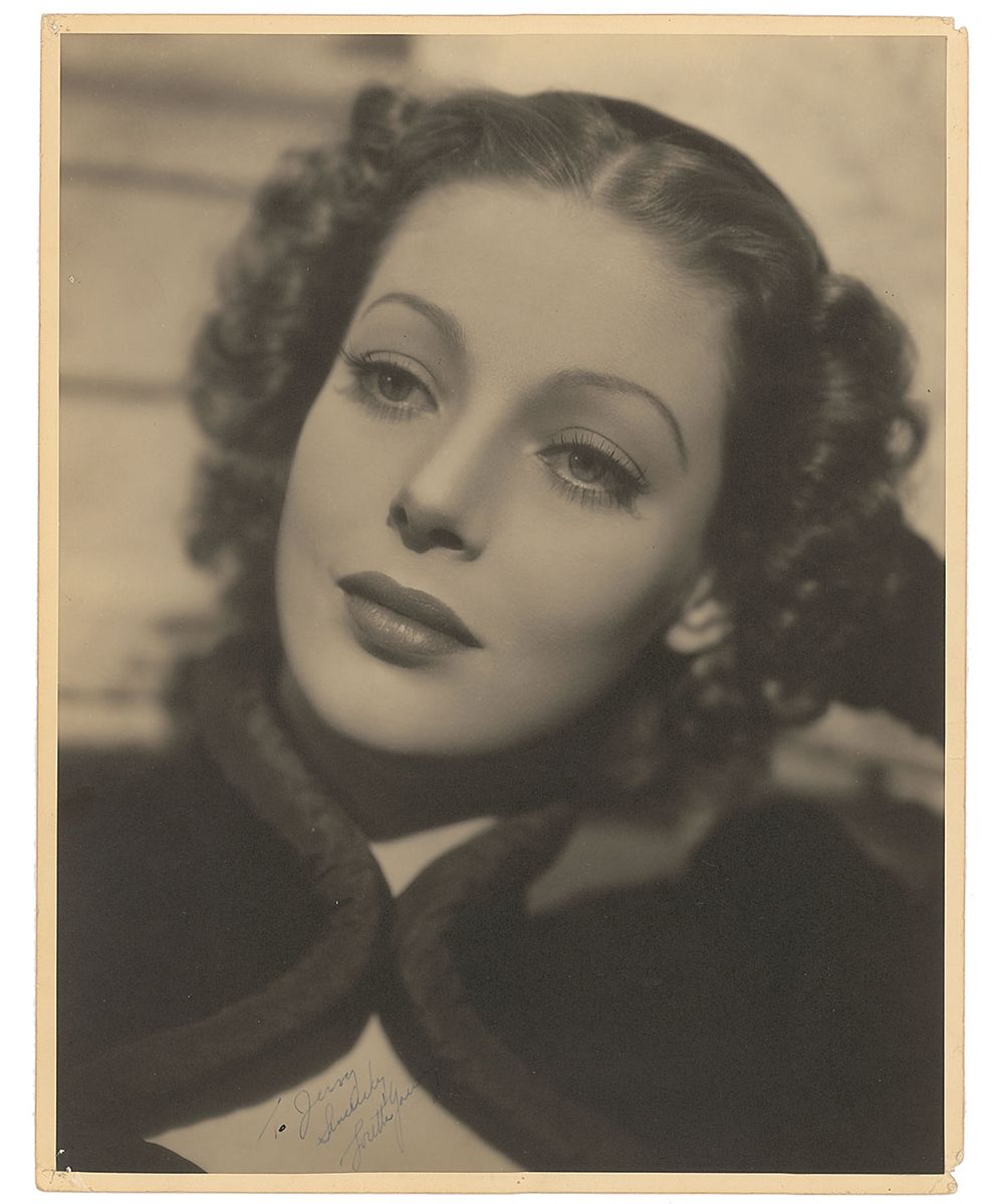 Matte-finish 11 x 14 head-and-shoulders photo, signed and inscribed in fountain pen, “To Jerry, Sincerely, Loretta Young.” In fine condition, with tack holes, small creases, and trivial paper loss to corner tips, and a small tack hole near left edge.
