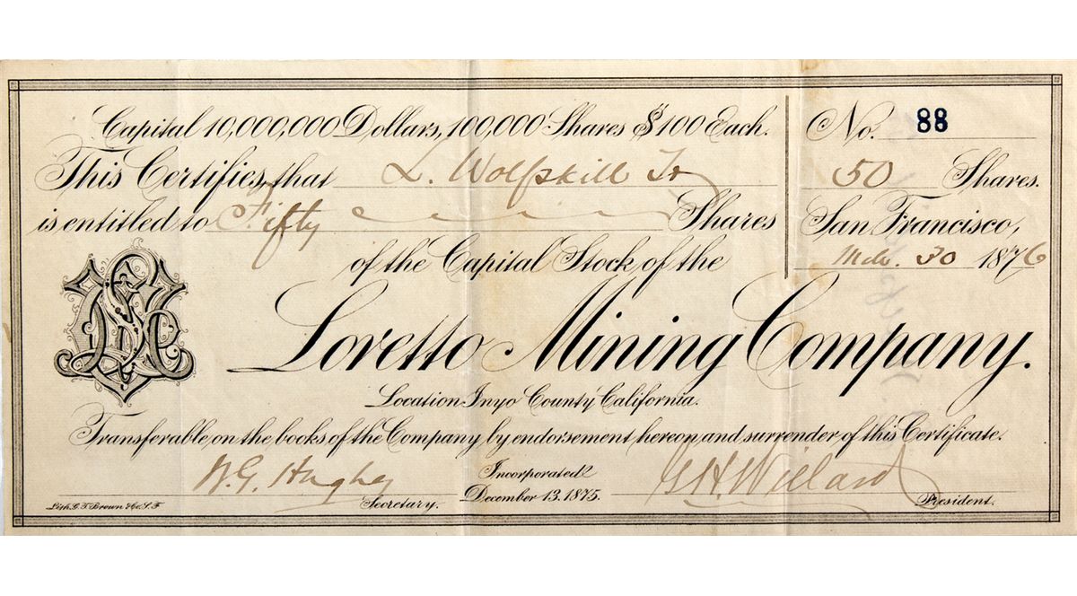 1876 Stock no. 8 issued on May 30th 1876 to L. Wolfskill Jr. for 50 shares. It was signed by Secretary Hughes and President Willard. The stock measures 9” x 4” and has some wear including creasing. Located out of Darwin in the heat of Death Valley, the Loretto Mining Co was formed in late 1875. [Ref: Palazzo; Darwin; California; 1996.] - HKA#62762