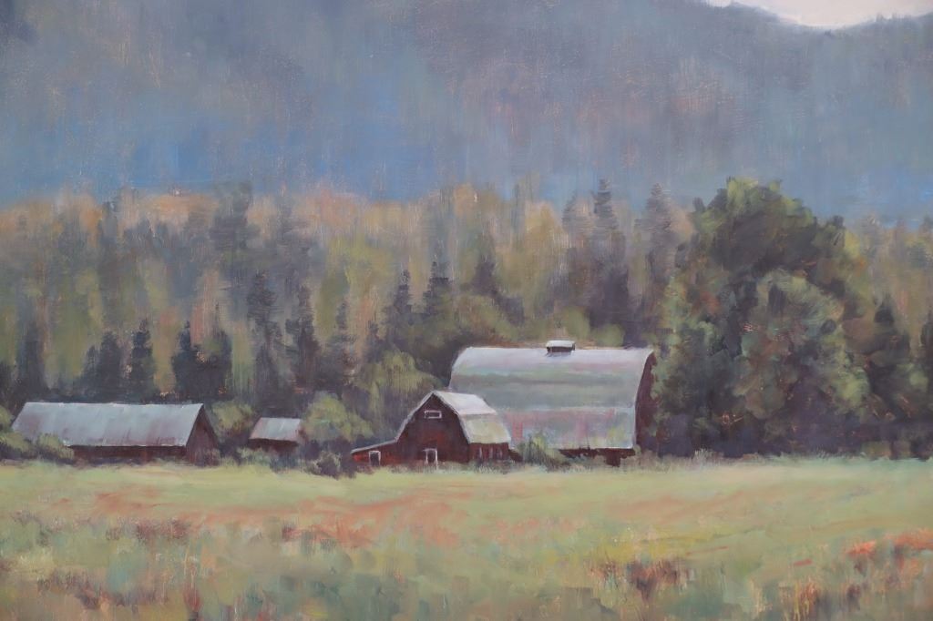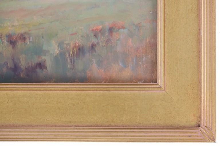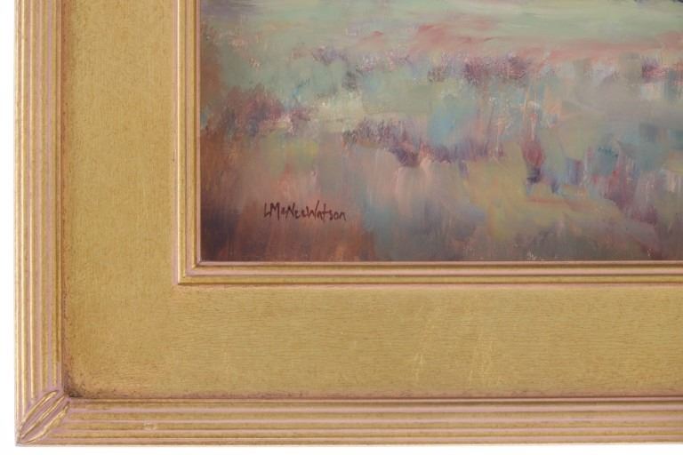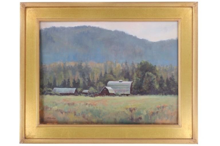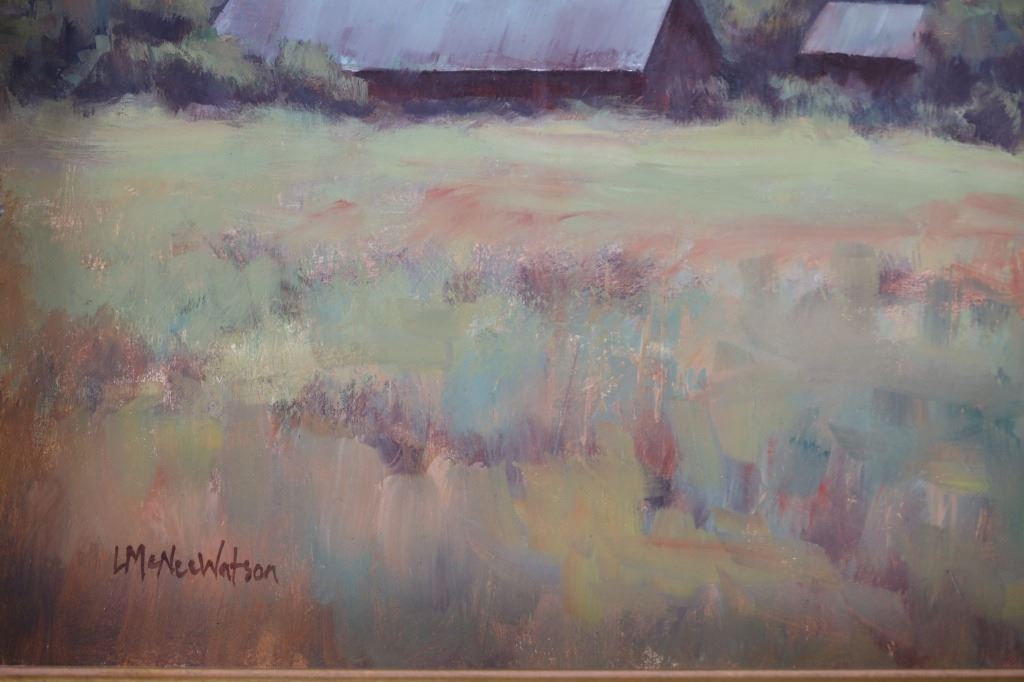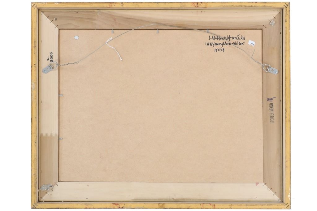Featured in this lot is this oil painting on board called "A Wyoming Morn-Wilson" by Idaho artist Lori McNee Watson born in 1965 and originally painted in 2006. The painting features a wonderfully and professionally crafted oil on board onstruction that shows a family farm at the base of a hillside with a morning hue to the lighting and fall coloration to the trees associated with the hillside. The artist signature can be seen in the bottom left hand corner. Lori McNee Watson was born in 1965 and is based in Sun Valley, Idaho. She is best known for her mastery of studio landscapes, plein air oil paintings, still lifes, and wildlife imagery, often incorporating birds and butterflies in settings resonant with light and atmosphere. Her artistic journey began in the 1980s and 1990s as a wildlife artist and illustrator, producing work for organizations such as Ducks Unlimited and The Nature Conservancy, along with contributions to duck and trout stamps and illustrated books . Since 2000, she has embraced water-mixable oils (notably Cobra brand), plein-air painting, encaustic wax, and studio still lifes inspired by Dutch Master techniques and Luminist traditions. In the art community, Lori is highly active: she is a Signature Member of Oil Painters of America, the American Impressionist Society, and the Heartland Art Club, and serves as a certified Master Artist in Cobra water-mixable oil paints. She also holds ambassador roles with Royal Talens and Princeton Brush Company, contributing to painting education, social media, and brand representation. Through her teaching, writing, painting, and online influence, Lori McNee Watson has become a respected voice in realistic oil painting, plein-air practice, and art-business guidance—earning a strong presence in the global artist community and among creative entrepreneurs. Lori McNee Watson was born in 1965 and is based in Sun Valley, Idaho. She is best known for her mastery of studio landscapes, plein air oil paintings, still lifes, and wildlife imagery, often incorporating birds and butterflies in settings resonant with light and atmosphere. Her artistic journey began in the 1980s and 1990s as a wildlife artist and illustrator, producing work for organizations such as Ducks Unlimited and The Nature Conservancy, along with contributions to duck and trout stamps and illustrated books . Since 2000, she has embraced water-mixable oils (notably Cobra brand), plein-air painting, encaustic wax, and studio still lifes inspired by Dutch Master techniques and Luminist traditions. In the art community, Lori is highly active: she is a Signature Member of Oil Painters of America, the American Impressionist Society, and the Heartland Art Club, and serves as a certified Master Artist in Cobra water-mixable oil paints. She also holds ambassador roles with Royal Talens and Princeton Brush Company, contributing to painting education, social media, and brand representation. Through her teaching, writing, painting, and online influence, Lori McNee Watson has become a respected voice in realistic oil painting, plein-air practice, and art-business guidance—earning a strong presence in the global artist community and among creative entrepreneurs. The condition of this oil painting on board is well preserved with some slight wear to the frames upper left hand corner but otherwise shows a well preserved overall condition. The measurements of this framed oil painting is 24 1/8" x 30 1/8" and the visible artwork measures 17 1/2" x 32 3/4". The collective weight of this oil painting is 7lb 6oz.