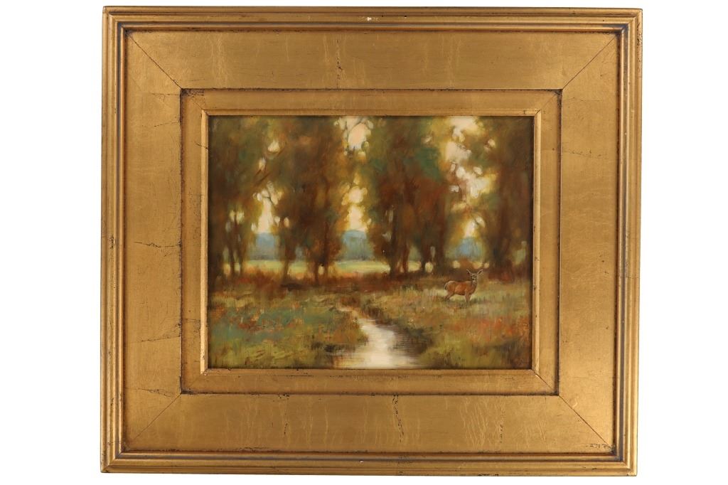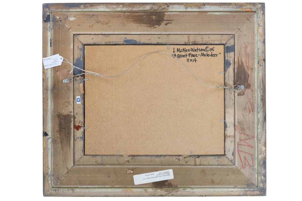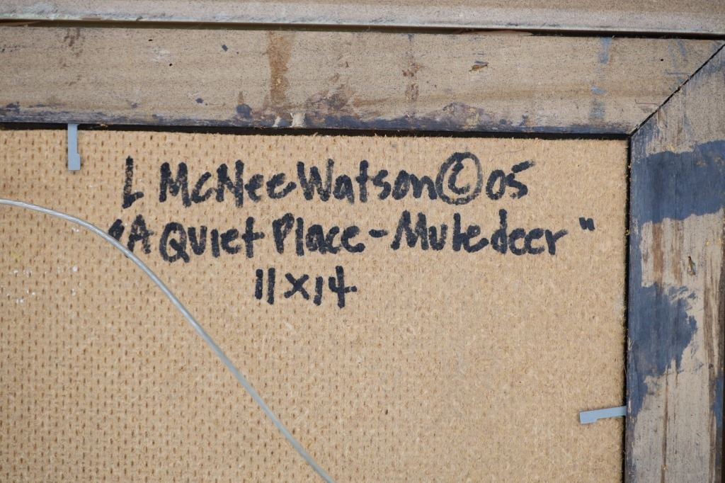 Featured in this lot is a oil on board called "A Quiet Place-Mule Deer" by Idaho artist Lori McNee Watson born in 1965. The oil painting features wonderfully and professionally crafted oil on board that shows a small stream with a doe mule deer looking on as McNee paints this still and shows a tree line in the distance with almost fall coloration to the foliage. The artist signature can be seen faintly in the bottom right hand corner and shows a high quality frame with a wide border and gold gilt coloration to the multi layer frame. In the art community, Lori is highly active: she is a Signature Member of Oil Painters of America, the American Impressionist Society, and the Heartland Art Club, and serves as a certified Master Artist in Cobra water-mixable oil paints. She also holds ambassador roles with Royal Talens and Princeton Brush Company, contributing to painting education, social media, and brand representation. Through her teaching, writing, painting, and online influence, Lori McNee Watson has become a respected voice in realistic oil painting, plein-air practice, and art-business guidance—earning a strong presence in the global artist community and among creative entrepreneurs. The condition of this of this oil painting is well preserved with no obvious signs of damage to the painting or the frame and shows a well preserved overall condition. The measurements of this framed oil painting is 19 1/2" x 22 1/2" and the visible artwork measures 10 1/2" x 13 5/8". The collective weight of this oil painting is 5lb 14oz.