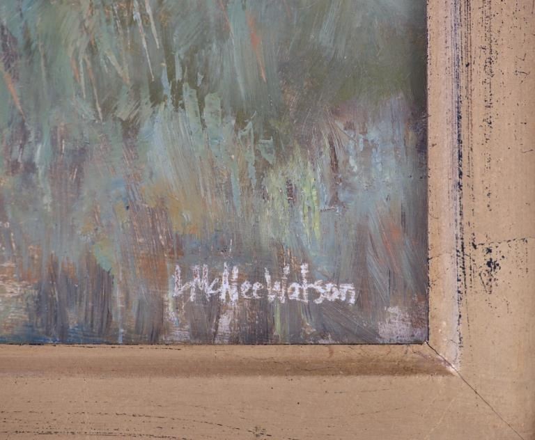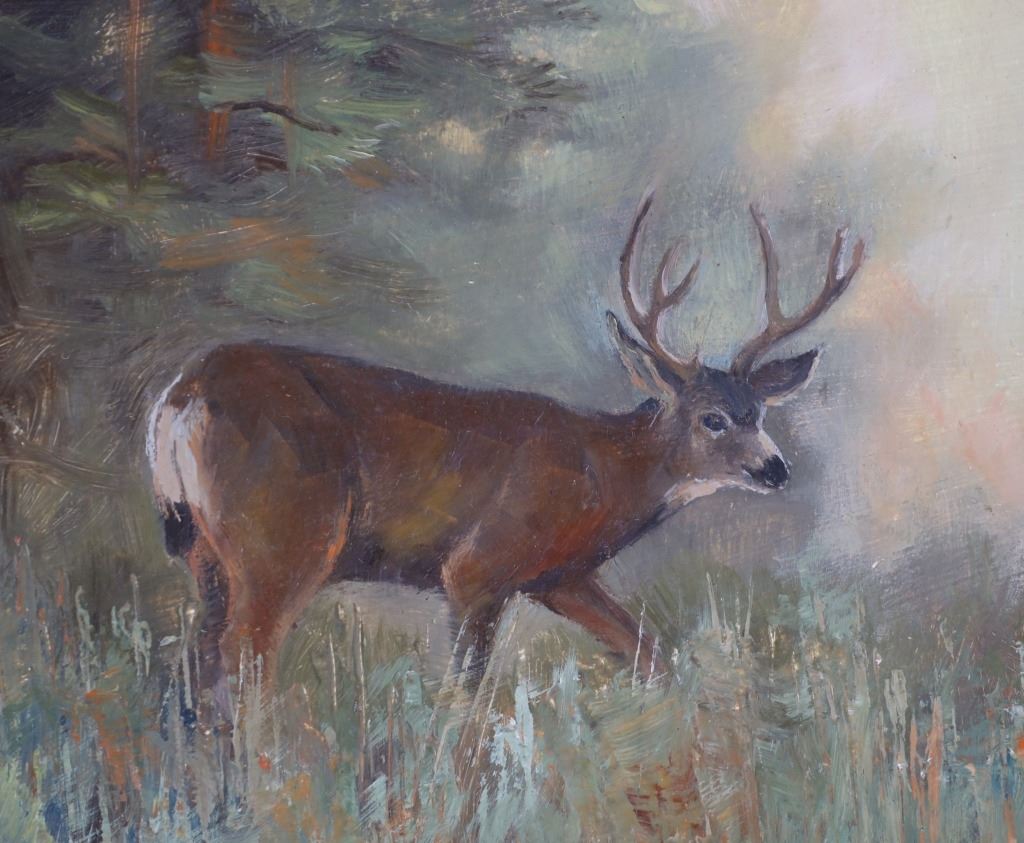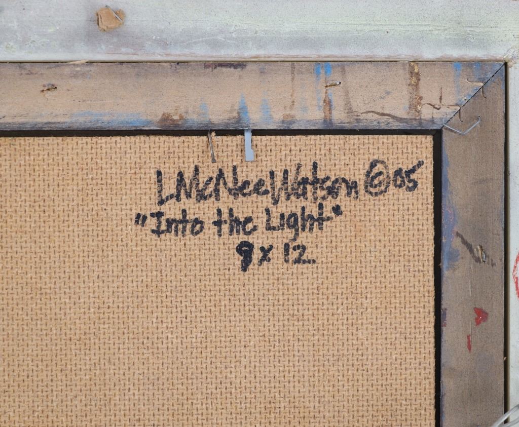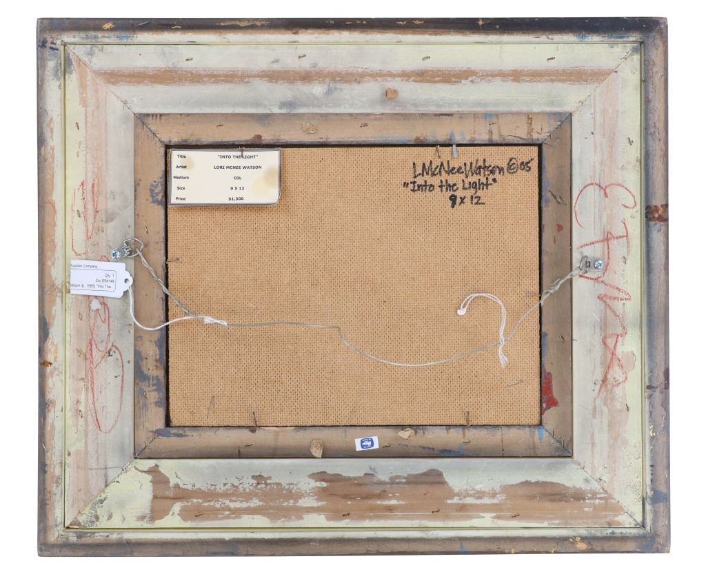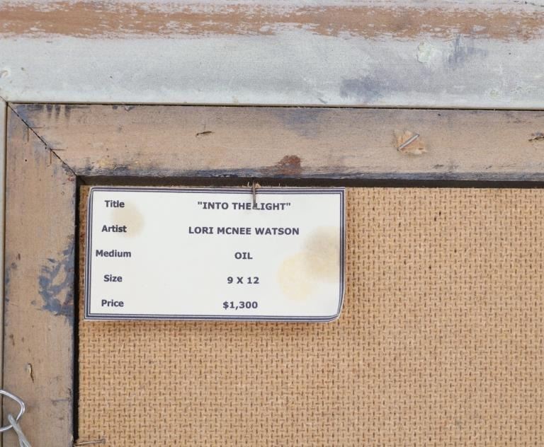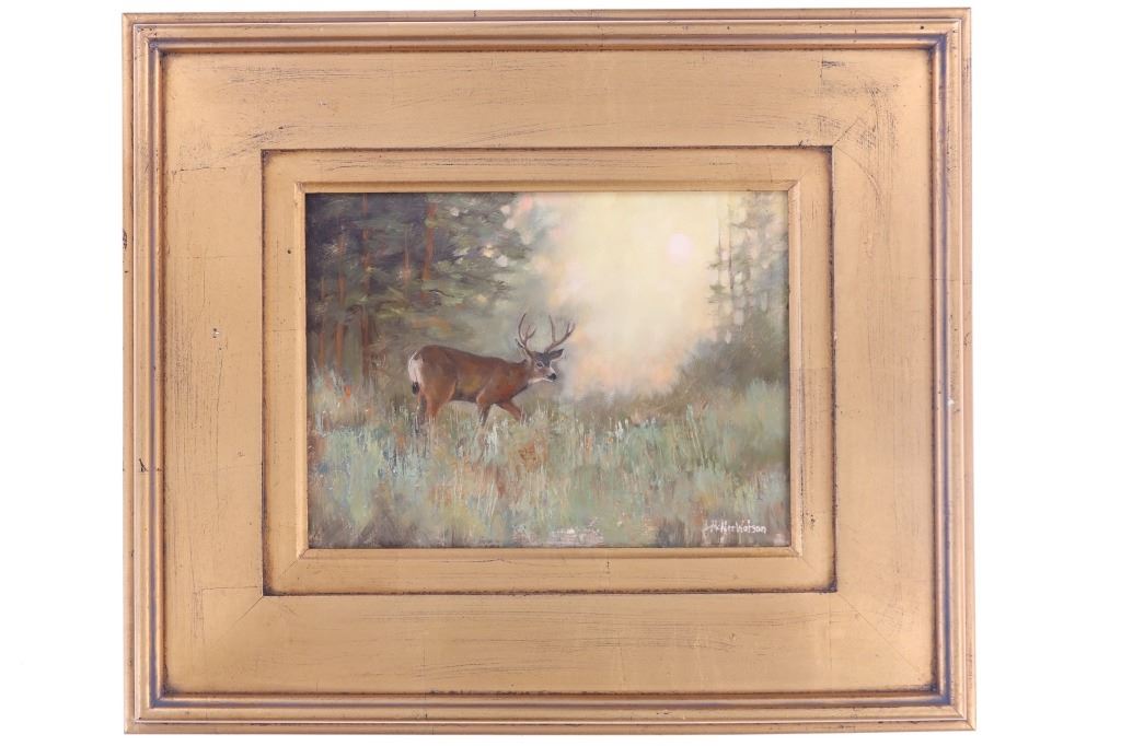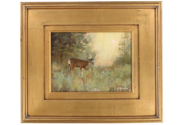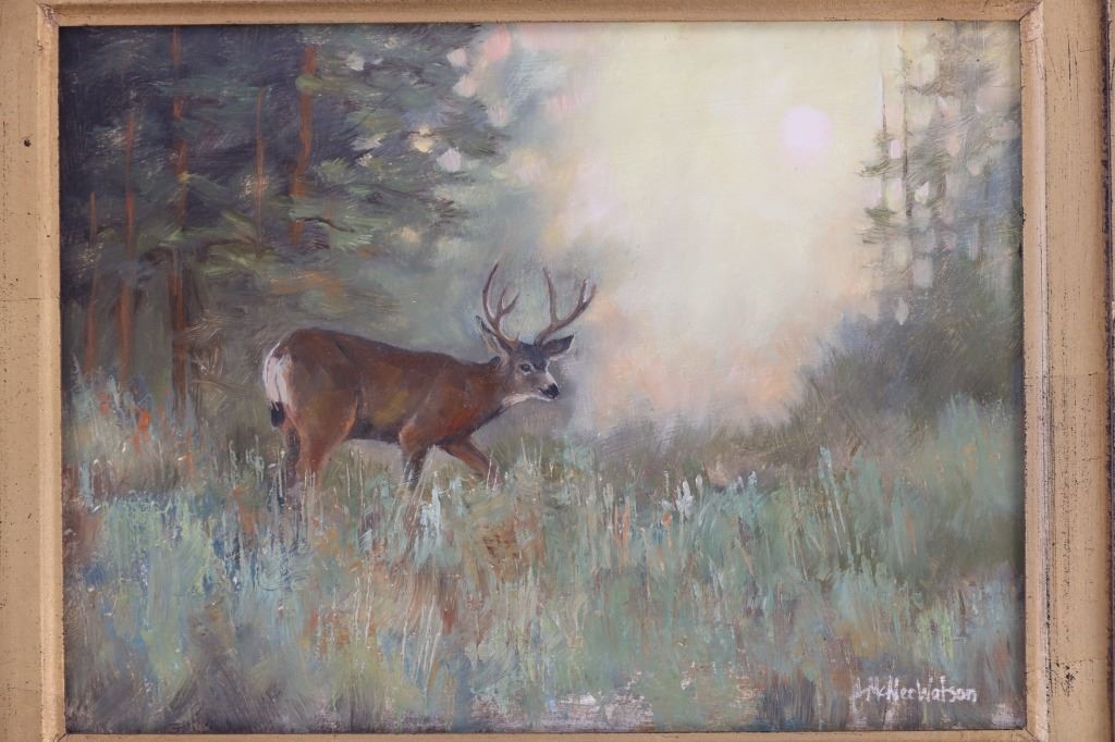 Featured in this lot is this original oil on board called "Into the Light" by Idaho artist Lori McNee Watson (b. 1965). The painting features a wonderfully and professionally crafted oil on board construction that shows a 3x3 buck with an abnormal right point grazing in an open field with tree line around the clearing; these are live actions scenes that Lori experienced and captured in real time. The artist signature is in the bottom right hand corner. Lori McNee Watson was born in 1965 and is based in Sun Valley, Idaho. She is best known for her mastery of studio landscapes, plein air oil paintings, still lifes, and wildlife imagery, often incorporating birds and butterflies in settings resonant with light and atmosphere. Her artistic journey began in the 1980s and 1990s as a wildlife artist and illustrator, producing work for organizations such as Ducks Unlimited and The Nature Conservancy, along with contributions to duck and trout stamps and illustrated books . Since 2000, she has embraced water-mixable oils (notably Cobra brand), plein-air painting, encaustic wax, and studio still lifes inspired by Dutch Master techniques and Luminist traditions. In the art community, Lori is highly active: she is a Signature Member of Oil Painters of America, the American Impressionist Society, and the Heartland Art Club, and serves as a certified Master Artist in Cobra water-mixable oil paints. She also holds ambassador roles with Royal Talens and Princeton Brush Company, contributing to painting education, social media, and brand representation. Through her teaching, writing, painting, and online influence, Lori McNee Watson has become a respected voice in realistic oil painting, plein-air practice, and art-business guidance—earning a strong presence in the global artist community and among creative entrepreneurs. The condition of this of this original painting is well preserved with no obvious signs of damage and shows a well preserved overall condition. The measurements of this framed painting is 17 3/8" x 20 1/2" and the visible artwork measures 8 1/2" x 11 5/8". The collective weight of this painting is 5lb 4oz.
