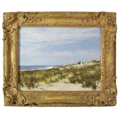 This is a beautiful beach landscape oil painting by Lori Zummo (1962-), the American artist known for her Barbizon-influenced style. Depicted is an isolated, brush-covered sand dune with a couple colorful beach umbrellas. Thin white clouds cover part of the sky on a pleasant summer day. Canvas measures 14" by 18" and frame measures 20" by 24". Weight is approximately 12-15 lbs.