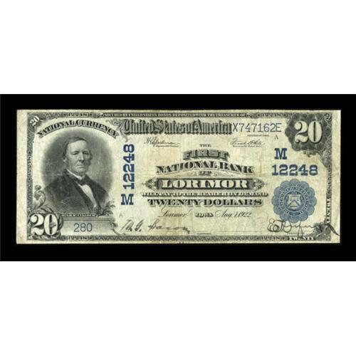 <B>Lorimor, IA</B></I> - $20 1902 Plain Back Fr. 661 <B>The First NB</B></I> Ch. # (M)12248<BR> While small size notes from this institution, which was Lorimor's sole issuer, are easily found, large notes are another matter entirely, with just seven pieces comprising the entire census. Pen signed <B>Very Good-Fine.</B></I><BR><I>From The Thomas M. Flynn Collection</B></I><BR><BR><b>Shipping:</b> Coins & Currency (<a target="_blank" href="http://www.heritageauctions.com/common/shipping.php">view shipping information</a>)