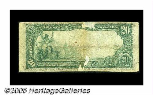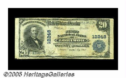 <B>Lorimor, IA</B></I> - 20 1902 Plain Back Fr. 6661 <B>The First NB</B></I> Ch. # 12248<BR>This otherwise <B>Fine</B></I> example has a few tape removal pulls on the back. It comes from the only issuing bank in Union County, an institution which issued $10 and $20 Plain Backs and the 1929 series only prior to closing in September of 1933. A scant $1,260 remained outstanding from its Third Charter emissions when it closed and only three examples have surfaced since then.