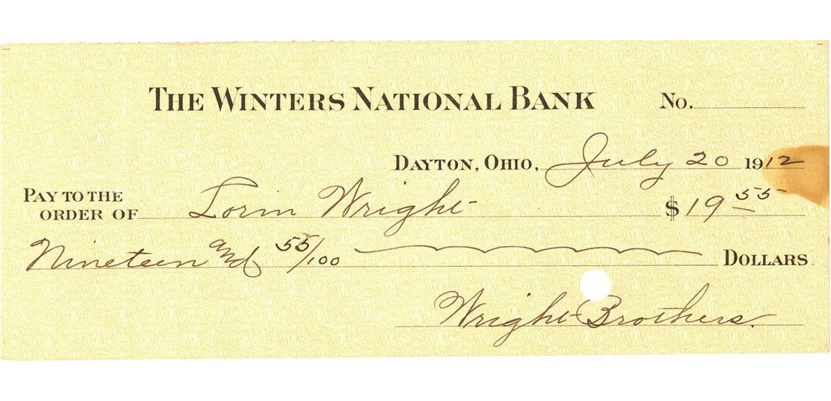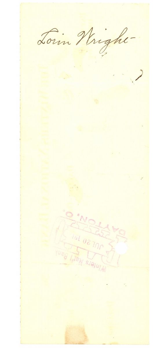 LORIN WRIGHT. Partly Printed Check filled out and signed:8½x3. Dayton, Ohio, July 12, 1912. Drawn on The Winters National Bank, payable to Lorin Wright for $19.55. he signed the check The Wright Brothers. Lorin Wright(1862-1939) helped sister Katharine manage the Wright Cycle Company while their brothers were in Kitty Hawk and helped his brothers in their aviation adventures form the start .