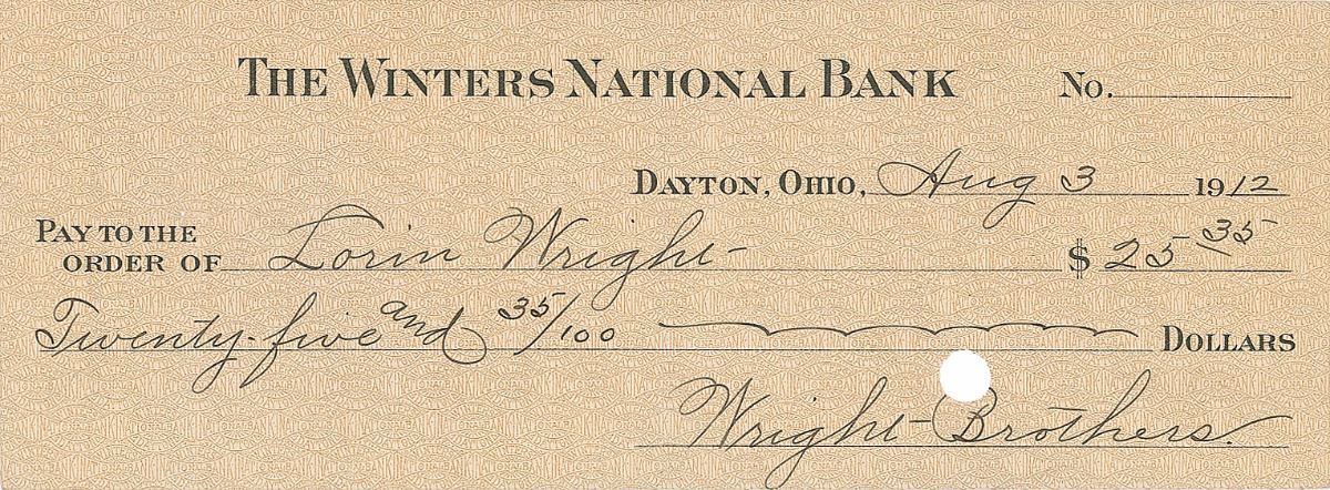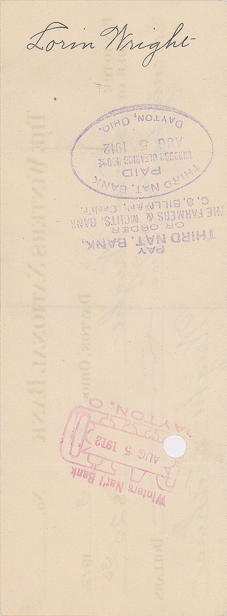 The Winters National Bank check, 8.25 x 3, filled out and signed by Lorin Wright, “Wright Brothers,” payable to Lorin Wright for $25.35, August 3, 1912, and endorsed on the reverse in black ink by Wright. In fine condition.