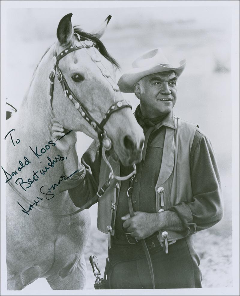 Glossy 8 x 10 photo of Ben Cartwright and his horse, signed and inscribed in black felt tip “To Donald Koos—Best wishes, Lorne Greene.” In fine condition.