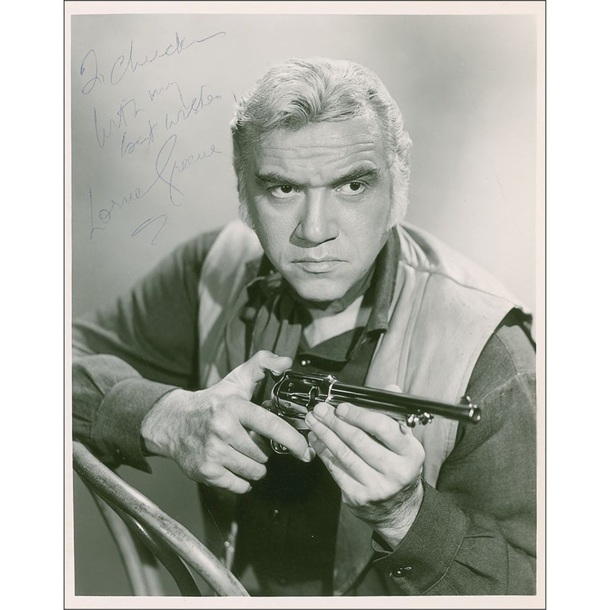 Glossy 8 x 10 photo of Greene as Ben Cartwright, signed and inscribed in blue ballpoint, “To Chuck, With my best wishes, Lorne Greene.” In very good condition, with a diagonal crease on the left side of the image, some other areas of light creasing, and light skipping to the signature and inscription.