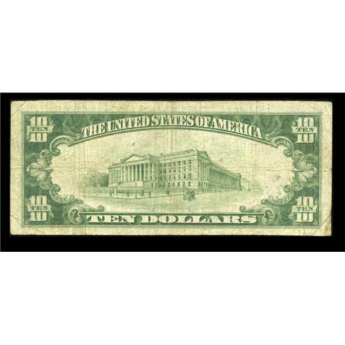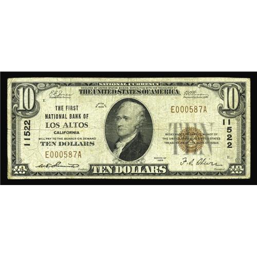 <B>Los Altos, CA</B></I> - $10 1929 Ty. 1 <B>The First NB</B></I> Ch. # 11522<BR>A decent circulated example from this one bank community, which has many more collectors than available notes. <B>Fine.</B></I>