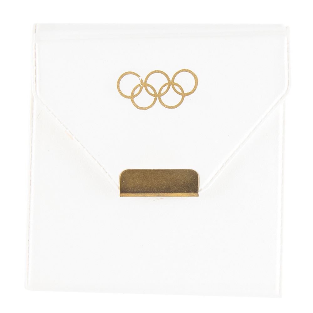 Desirable participation pin from the 1932 Los Angeles Summer Olympics, 15 mm x 18 mm, featuring the Olympic rings over a flaming torch inscribed with the year, "1932." Includes its Bertoni pouch gilt-stamped with the Olympic rings, and its original presentation card, imprinted: "Games of the Xth Olympiad, 1932, Participant, No. 96928."