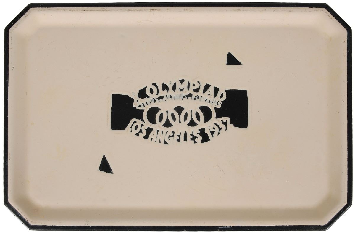Souvenir white porcelain enameled metal tray from the 1932 Los Angeles Summer Games, 13 x 8.5, featuring the Olympic rings in the center, surrounded by the words, “X Olympiad, Citius, Altius, Fortius, Los Angeles 1932.” In very good to fine condition.