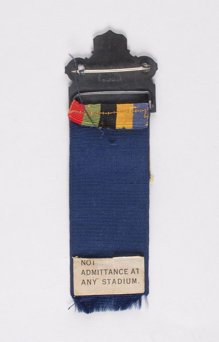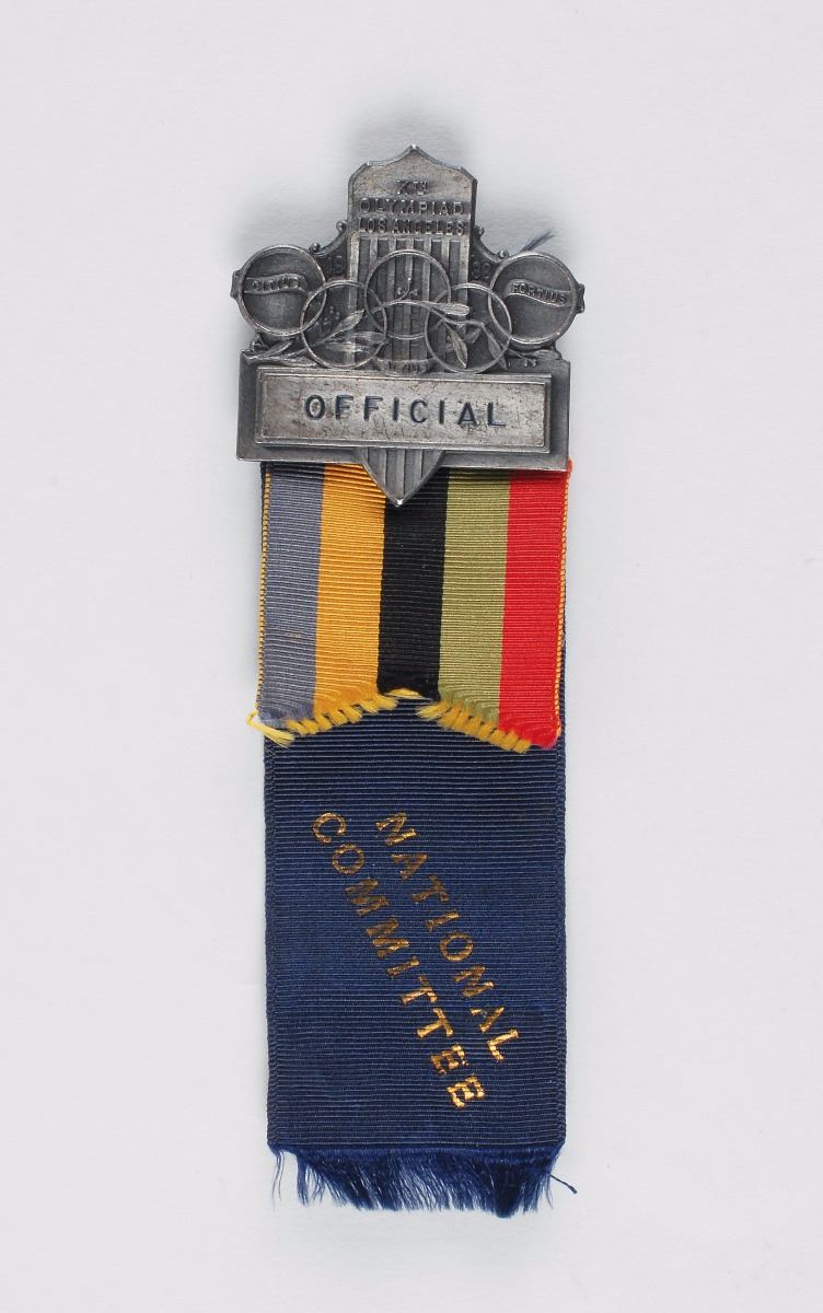 National Committee Official badge issued for the 1932 Los Angeles Olympic Games. Silvered, 38 mm x 120 mm, 16 gm, manufactured by Whitehead & Haug of Newark. The medal features the Olympics rings over shield and laurel branch, and is engraved “Xth Olympiad Los Angeles, Official.” Suspended below the badge is a small ribbon with Olympic colors, and then another ribbon, blue, with gold lettering, “National Committee.” Official badges with silver medallions were issued to secretaries and members of the numerous Olympic committees and federations. While the color of the ribbon identified the organization or the sport, an additional Olympic ribbon was created, bearing the five Olympic colors in vertical stripes; this ribbon, when attached to a badge, entitled the wearer to special privileges including admission to the Olympic Village. If the badge had an Olympic ribbon with a silver medallion, such as this, the wearer was the secretary of the International Sports Federation. Despite their high status amongst Olympic officials, none of the badges issued to the various Olympic committees or federations granted admission into the stadiums; all persons holding such badges were issued regular tickets of admission.