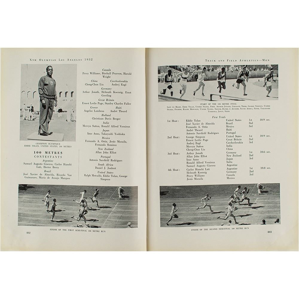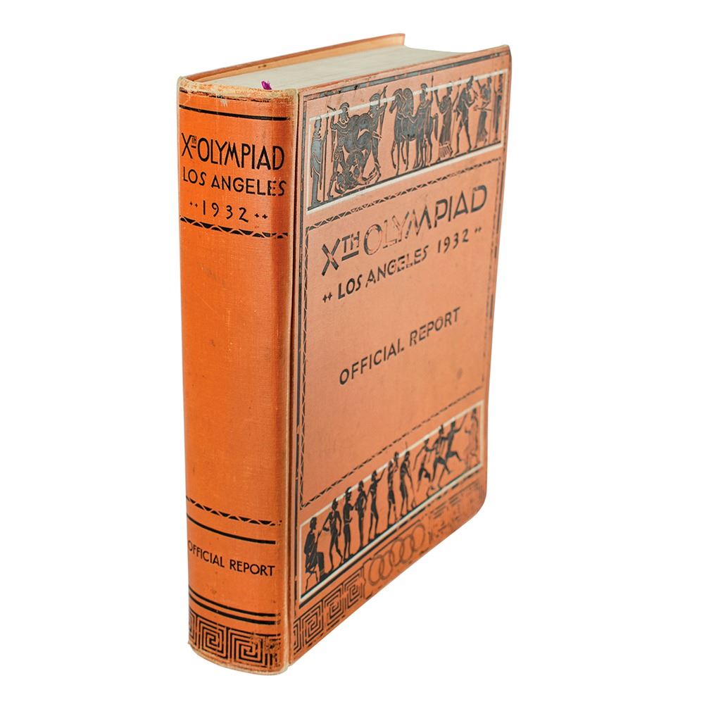 Desirable book: Xth Olympiad, Los Angeles, 1932, Official Report. First edition. Los Angeles: Xth Olympiade Committee of the Games of Los Angeles, U.S.A. 1932, Ltd, 1933. Hardcover, 9.75 x 12.5, 814 pages. This impressive volume provides an exhaustive and extensively illustrated chronicle of the Games, covering everything from the planning stages of the event to the athletic competitions themselves. Book condition: VG-/None, with noticeable rubbing to boards, a cracked rear hinge, wear to corners, and light dampstaining to bottom of textblock.