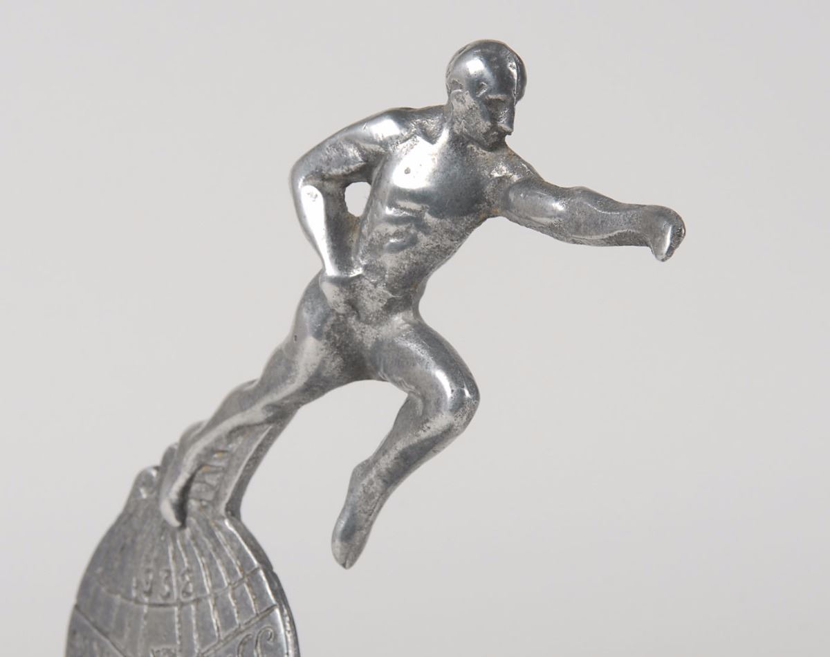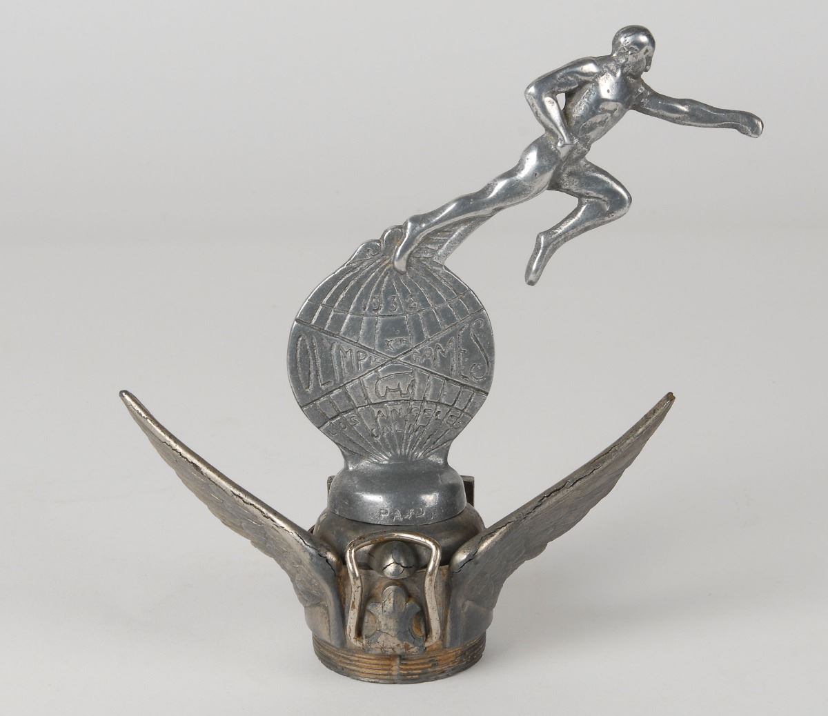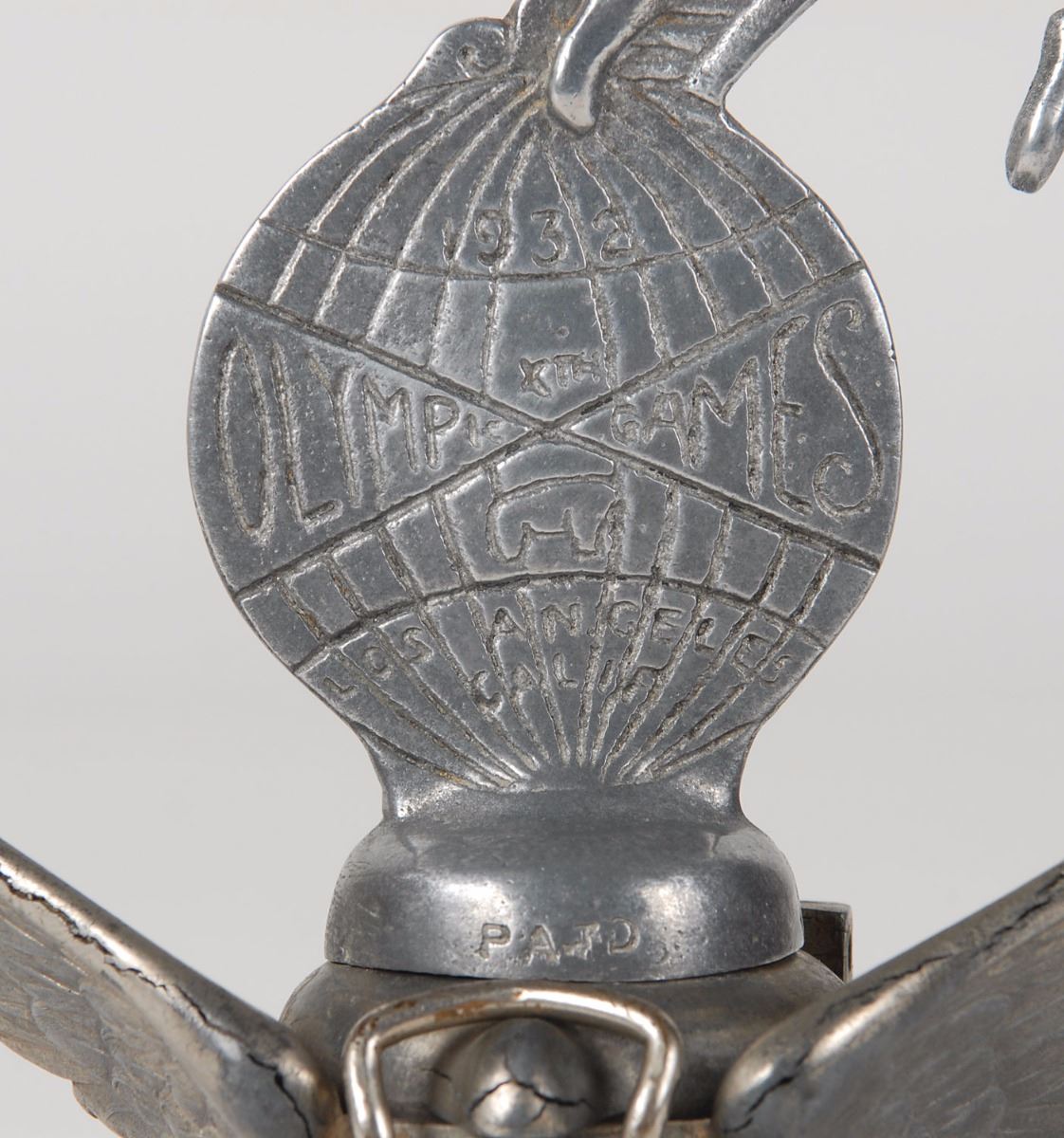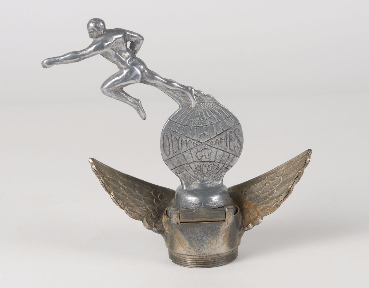 Unusual and highly appealing metal radiator topper commemorating the 1932 Los Angeles Summer Olympics. The 7? tall topper features a winged base with a man leaping from a globe, engraved on both sides, “1932, Xth Olympic Games, Los Angeles, Calif,” with lower portions of the globe engraved with “PATD” and “8–4–31.”