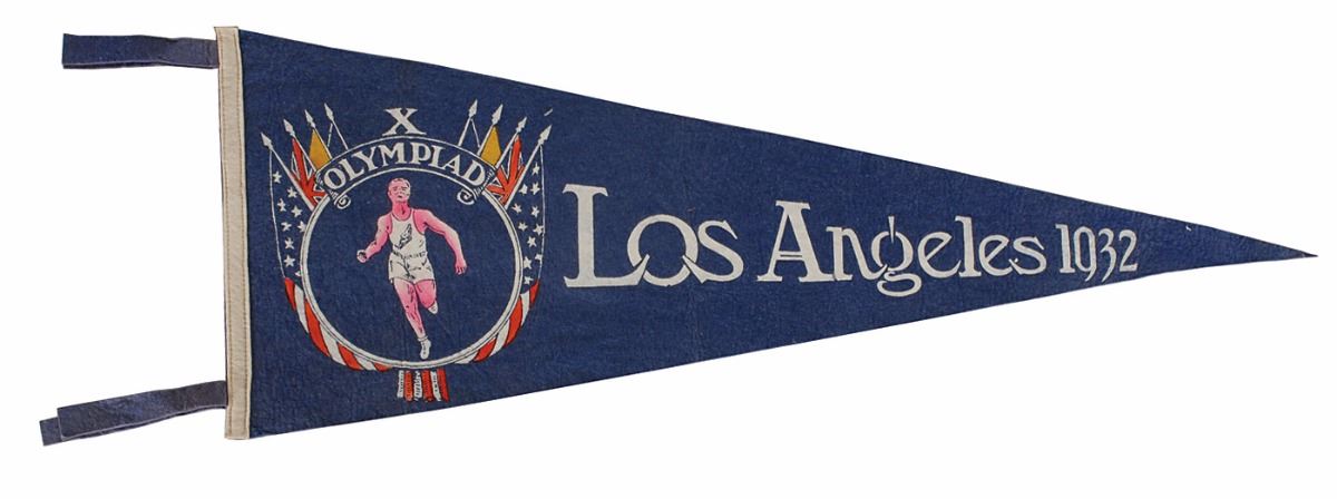 Navy blue felt pennant for the 1932 Los Angeles Summer Olympics, measuring 28.5? long, featuring a runner within an “X Olympiad” design topped by international flags, with elaborate white text, “Los Angeles 1932.” The pennant retains its original ties at the left edge.
