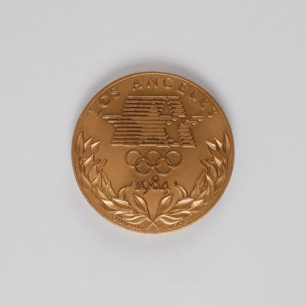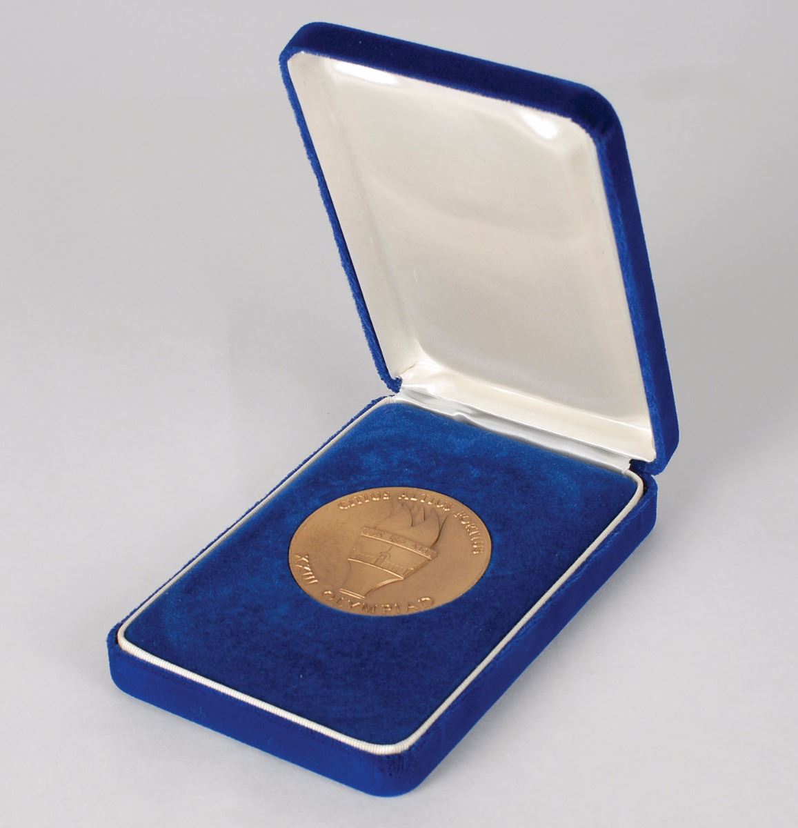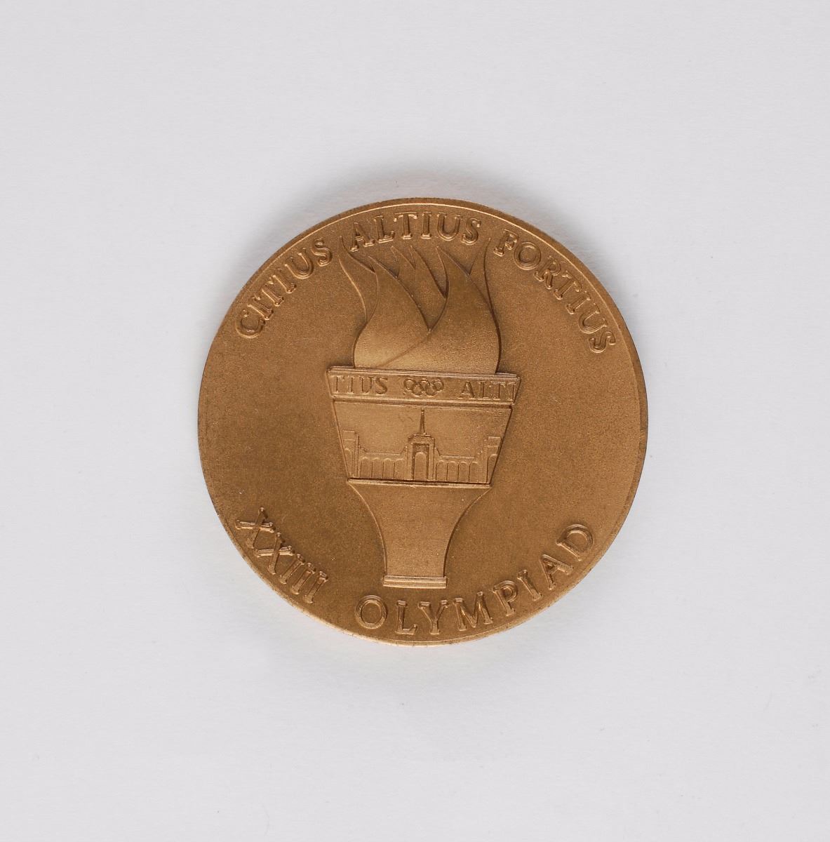 Uncommon participation medal issued for the Los Angeles 1984 Summer Olympics. Bronze, 60 mm, 94 gm, by Dugland Stermer. The front depicts the Olympic torch with raised text, “Citius Altius Fortius, XXIII Olympiad”; the reverse features the Los Angeles Games emblem over Olympic rings and laurel branches. Includes the original blue presentation box and velvet case.