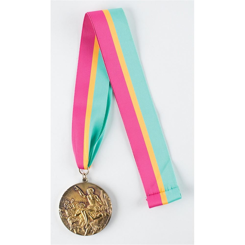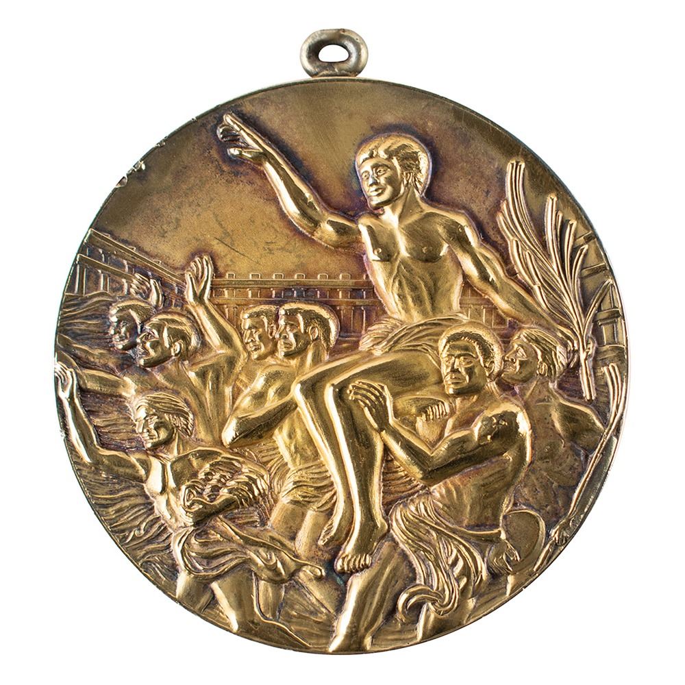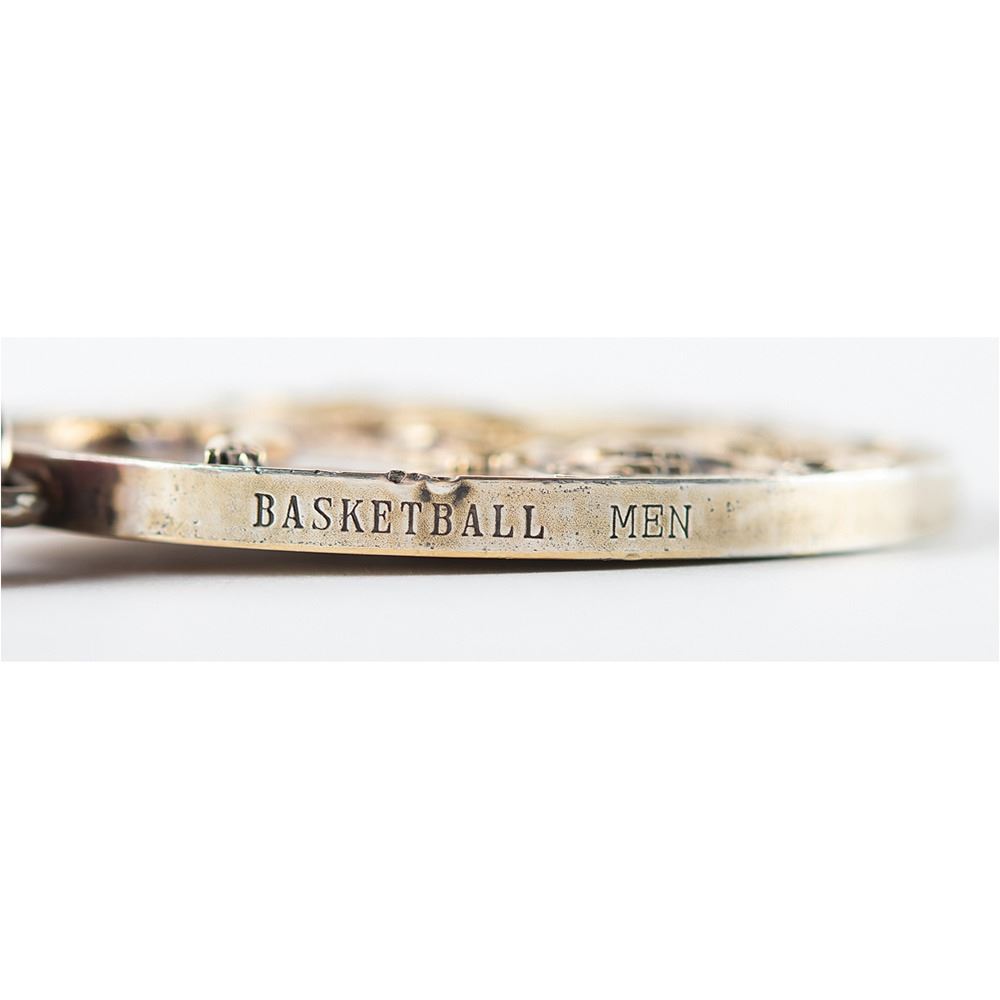 Magnificent winner's medal awarded to a member of the United States men's basketball team at the Los Angeles 1984 Summer Olympics. Gilt silver, 63.5 mm, 143 gm, by Dugald Stermer, Indianapolis. The front, inscribed, "XXIII Olympiad, Los Angeles 1984," features a 'Seated Victory' with the Colosseum in the background; the reverse portrays a victorious athlete being carried by a jubilant crowd. The edge is inscribed with the name of the event, "Basketball, Men." Medal bears some darkened areas and dings to edges. Complete with original magenta, vermillion, and yellow ribbon.