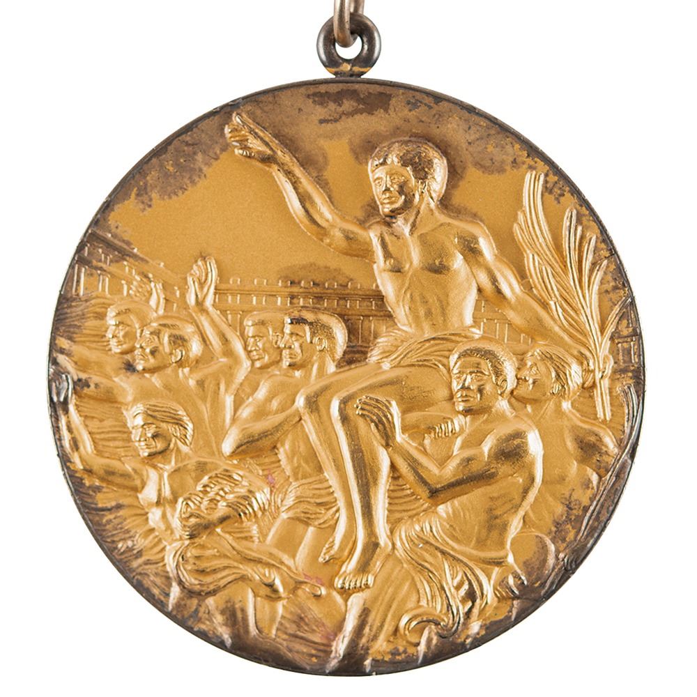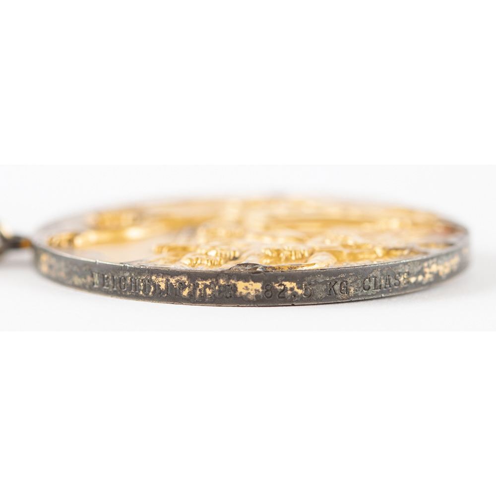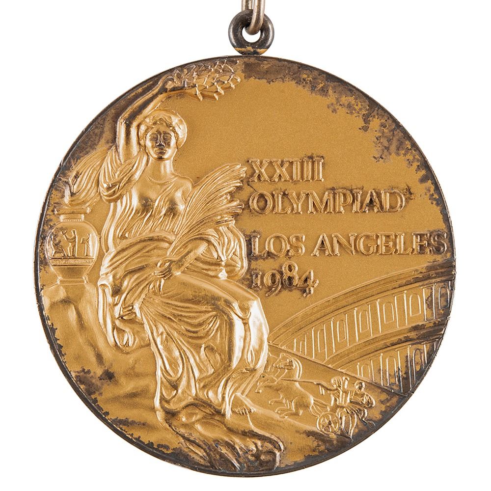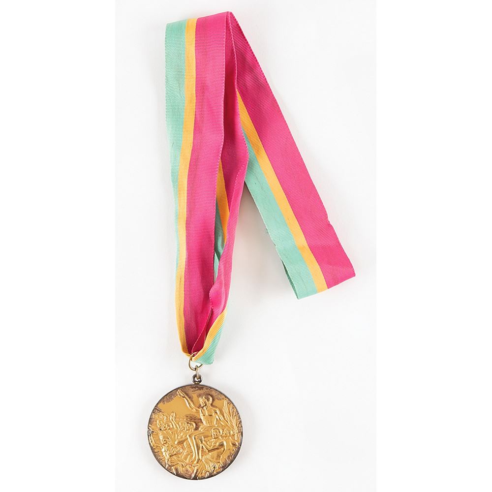 Winner’s medal issued for the Los Angeles 1984 Summer Olympics. Gilt silver, 63.5 mm, 144 gm, designed by Dugald Stermer and struck by Jostens, Indianapolis. Inspired by the original design by Giuseppe Cassioli, the front of the medal is inscribed, “XXIII Olympiad, Los Angeles 1984,†and features a ‘Seated Victory’ with the Colosseum in the background, and the reverse portrays a victorious athlete being carried by a jubilant crowd. The edge is inscribed with the name of the event, "Weightliftingâ€; the athlete's name will be provided to the winning bidder. Complete with original magenta, vermillion, and yellow ribbon, which is separated at the seam. Exhibits some rubbing and wear to the gilt on the rim, the edge, and relief high points. Only 478 of these gold medals were produced for the LA Games. A scarce, attractive medal from this memorable USA-hosted Olympiad. Accompanied by a signed letter of provenance from the winning athlete.