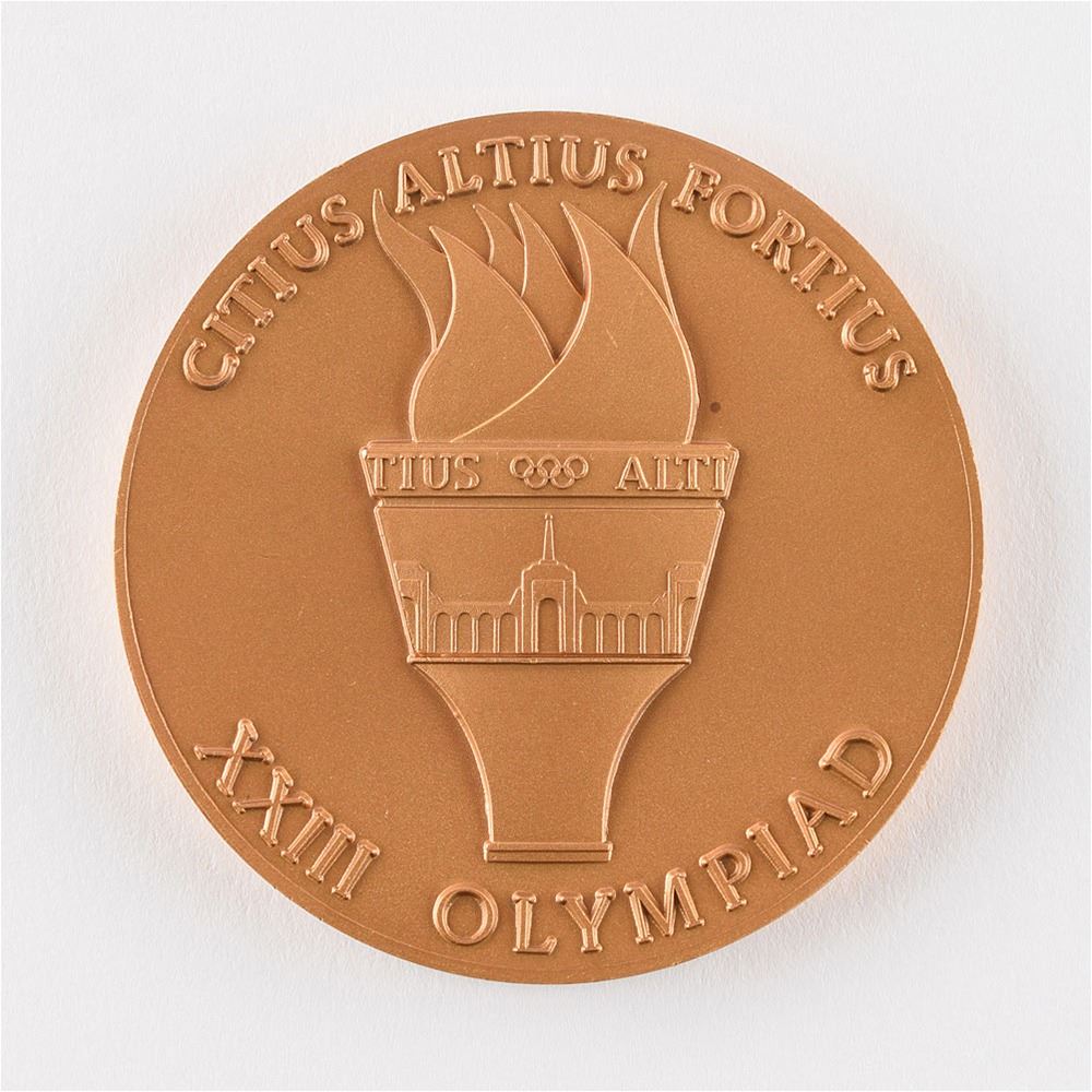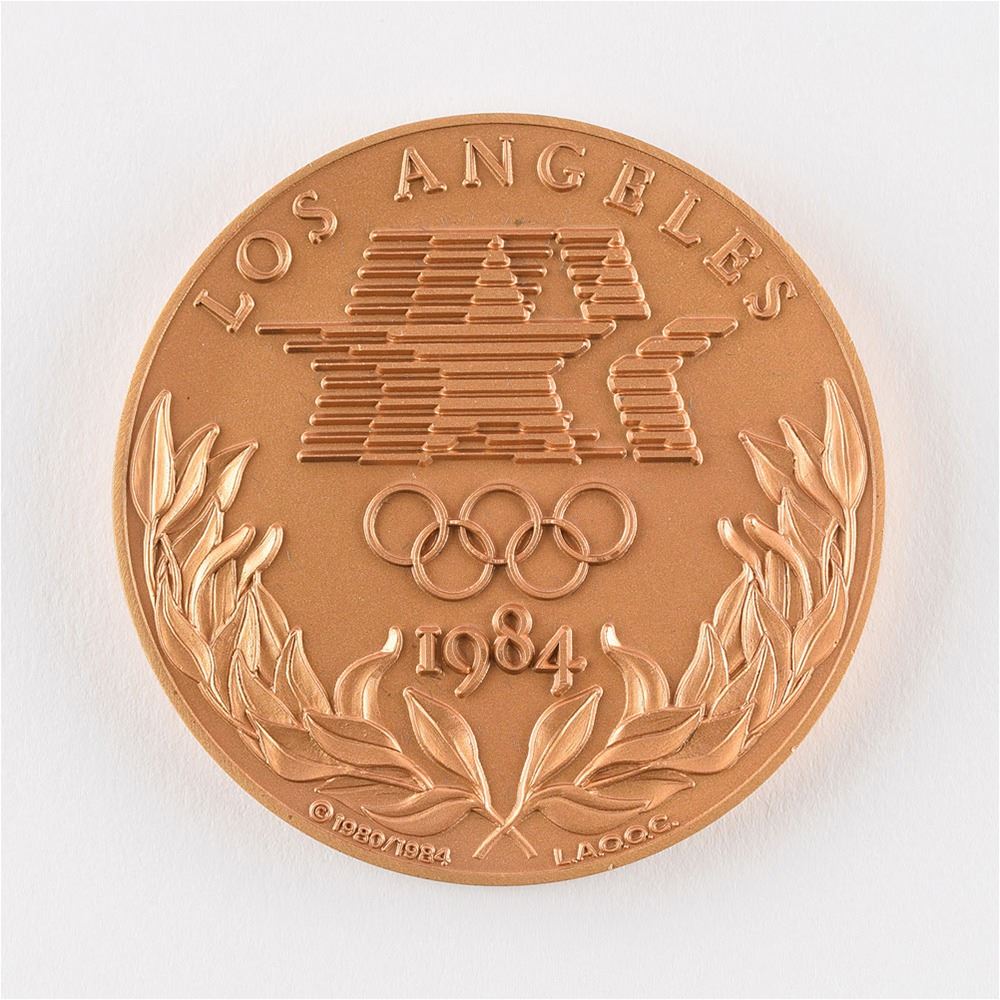 Participation medal issued for the Los Angeles 1984 Summer Olympics, as presented to athletes and officials. Bronze, 60 mm, 94 gm, by Dugald Stermer/Jostens. The front depicts the Olympic torch with raised text, “Citius Altius Fortius, XXIII Olympiad”; the reverse features the Los Angeles Games emblem over Olympic rings and laurel branches. Complete with its original blue velvet presentation case and cardboard box.