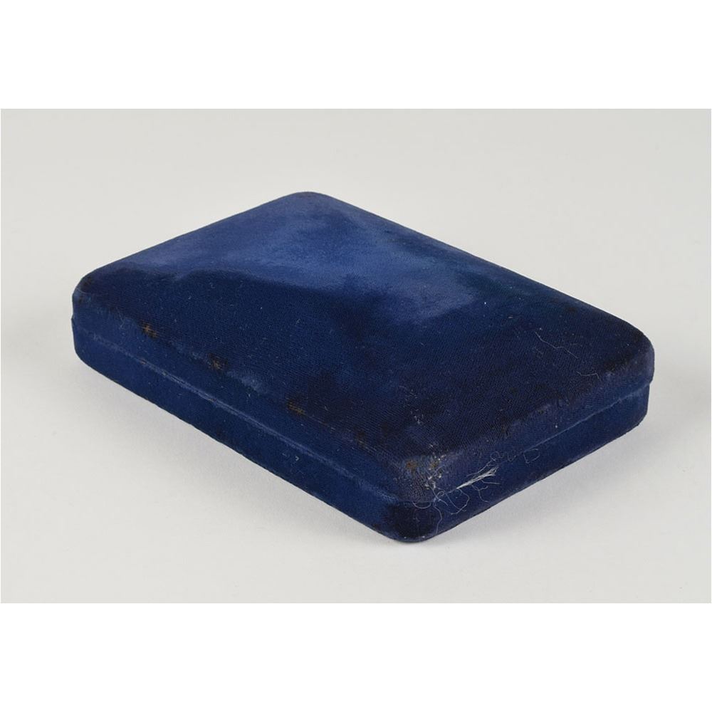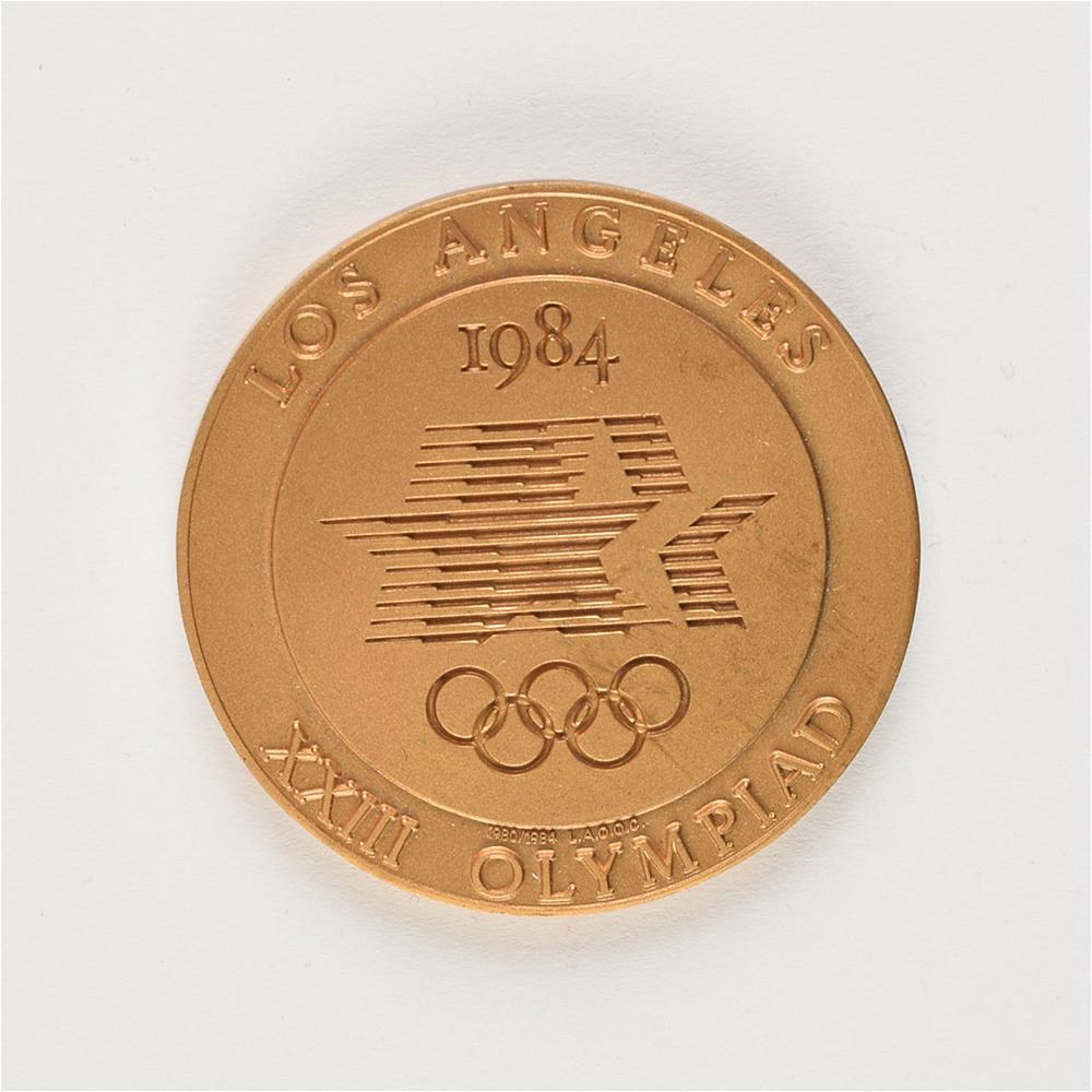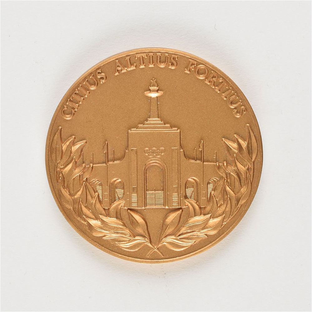 Volunteer participation medal issued for the 1984 Los Angeles Summer Olympics. Bronze, 60 mm, 94 gm. The front features the Olympic motto “Citius Altius Fortius,” with a raised depiction of the LA Coliseum above crossed laurel branches; the reverse shows the official logo above Olympic rings with the text, “Los Angeles 1984, XXIII Olympiad.” Complete with its original blue velvet presentation case, which has been repaired.