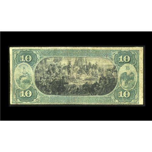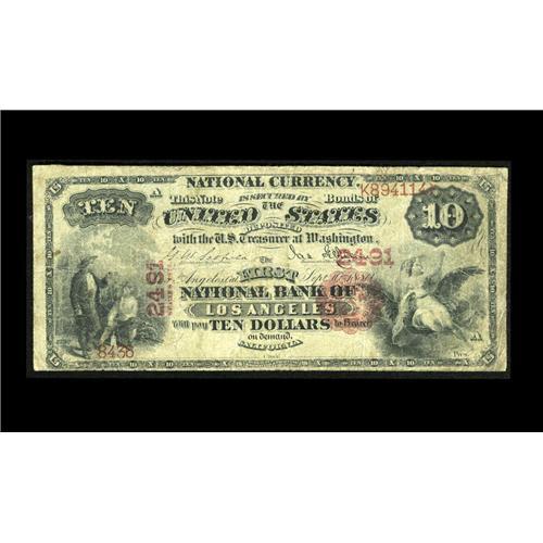 <B>Los Angeles, CA</B></I> - $10 1875 Fr. 419 <B>The First NB</B></I> Ch. # 2491<BR>An exceptionally rare California type and denomination. Although you would not know it from the price, $10 National Gold Bank Notes outnumber $10 First Charters by over a five to one ratio, with over one hundred $10 Gold Bank Notes to under twenty First Charter tens. Six of that number come from this bank, before being sold in September 2004 this example from the Horwedel collection was off the market for several decades. <B>Very Good,</B></I> likely to see bidding reach or exceed...