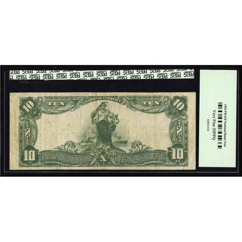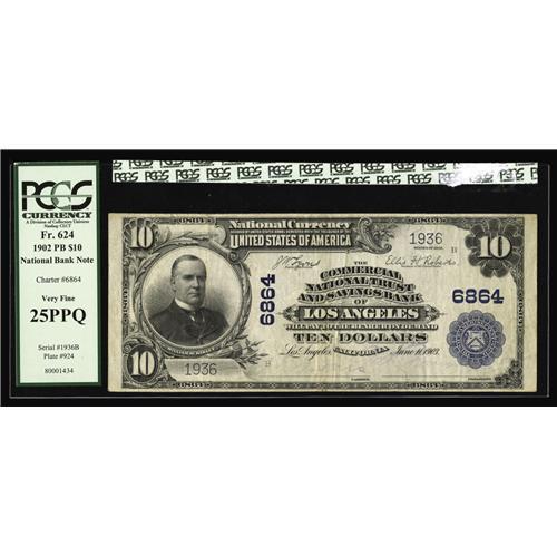 <B>Los Angeles, CA</B></I> - $10 1902 Plain Back Fr. 624 <B>The Commercial National Trust & Savings Bank</B></I> Ch. # 6864<BR>This note is from the much scarcer second title for this charter number that exited the banking stage on March 15, 1927. The purple stamped signatures are light as is customary for this bank. <B>PCGS Very Fine 25PPQ.</B></I>